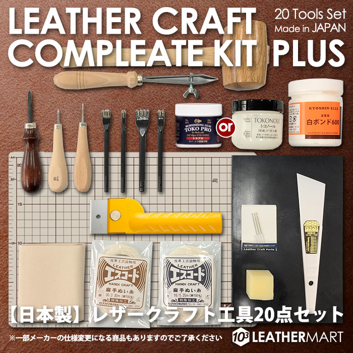 【コンプリートキットPLUS】 レザークラフト手縫い用工具18点+2点 道具を買い足さなくても直ぐにレザークラフトが始められるコンプリートキットです。これで手縫いは完璧です!更に革をカットする別たちと下に敷くカッターマットもセットになりました! セット内容 ・菱目打ち2本(2.5mm巾)1本 ・菱目打ち4本(2.5mm巾)1本 ・菱目打ち2本(1.5mm巾)1本 ・菱目打ち4本(1.5mm巾)1本 ・ジラコヘラ40mm1本 ・ゴム板(小)1枚 ・丸錐1本 ・菱錐1本 ・エスコード麻糸(太)生地25m ・エスコード麻糸(細)生地30m ・メリケン針(3本) ・ミニロウ1個 ・白ボンド(180ml)1個 ・床面処理剤1個 ※トコノールかトコプロが入ります ・木槌(タイコ)1本 ・ネジ捻1本 ・ヘリおとし0.8mm1本 ・コバ磨き帆布1枚 ・OLFA 別たち 1本 ・OLFA カッターマットA4サイズ 1枚 ※仕入れ状況により工具の形状が多少異なる場合もございますが、使用上問題ありませんので安心してお使いください。 特 典 ・詳しいマニュアルブック付き ・丸錐、菱錐カバー ミニキット ハンドソーイングキット 菱目打ち タイコ トコノール ヘリ落とし エスコード コバ磨き 帆布 革小物 制作 キーケース キーホルダー コインケース パスケース カードケース 名刺ケース サイフ ウォレット ロングウォレット ハーフウォレット スマホケース メガネケース ペンケース 時計ベルト ミニチュア小物 ドール用小物 手帳 作れる ご購入前に ※接着剤は航空運輸が出来なくなった為、こちらの商品の沖縄、離島へのお届けは3日〜1週間かかりますので予めご了承ください。