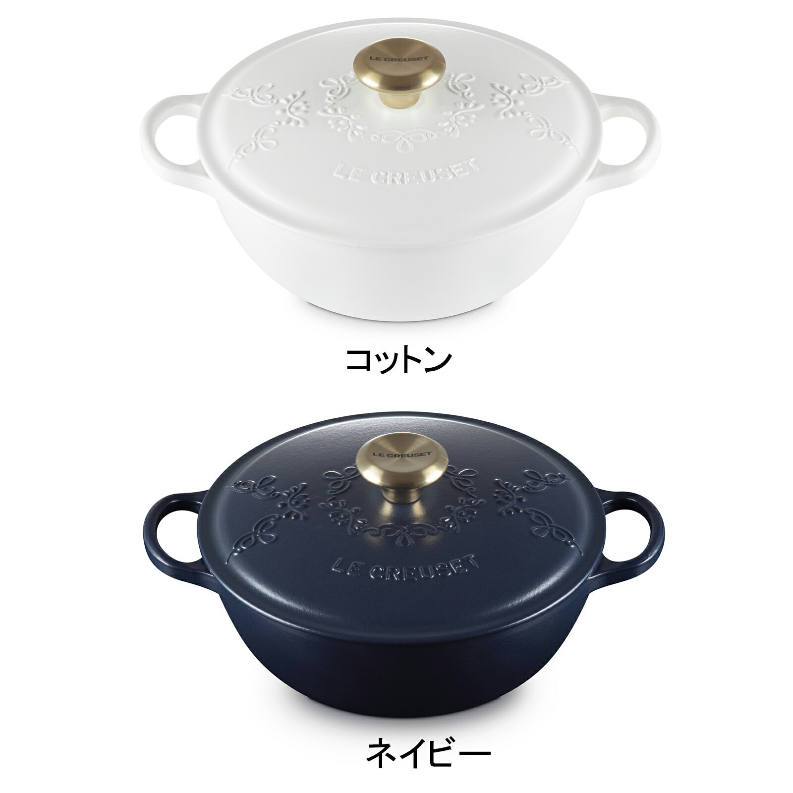 商品名 シグニチャー マルミット 24cm エタニティレース (ブラックマットホーロー・ライトゴールドツマミ) 商品詳細 丸みを帯びた本体が特徴の「マルミット」のフタに、レースのようなエレガントなレリーフを施したシーズナル限定デザイン。マットな質感が美しい、雪を思わせる「コットン」と夜空を連想させる「ネイビー」の2色展開。レードルやターナーが使いやすい丸い鍋底は食材が混ぜやすく、野菜のソテーやリゾット作りに最適。骨付き肉や丸魚など大ぶりな食材も調理しやすい余裕のあるサイズで、大人数の料理にもおすすめです。 世代を越えて世界中のキッチンで愛され続けてきたル・クルーゼの鋳物ホーローウェア。鋳物ホーローならではの優れた熱伝導性と蓄熱性で、食材のうまみを最大限に引き出し、料理をおいしく仕上げます。 フタに3カ所突起があることで、隙間からゆっくり均一に蒸気を逃がし、うまみが凝縮。吹きこぼれもしにくいので、じっくり火にかけていても安心です。内側には「ブラックマットホーロー」加工を施し、食材がくっつきにくく、焼き付けから煮込みまで幅広く活躍します。色移りもしにくいので、お手入れも簡単です。 商品情報 [サイズ] ・直径(取手込):25(32)cm ・高さ(フタ込):15cm ・深さ:9cm ・底径:12cm ・容量:3.1L ・重量:3.6kg *ツマミのカラーは画像でご確認ください。 *ステンレス製のシルバー以外のツマミ(ゴールド、ライトゴールド、カッパー、イリディセント等)の付いたフタは食洗機の使用をお避け下さい。変色する可能性があります。 *底径が小さいため、IHクッキングヒーターの規格によっては使用できない場合があります。 *炊飯の場合、直径24cm以上のお鍋は、熱源によって炊きあがりにムラができる場合がございます。 *「コットン」「ネイビー」はマット加工が施されたカラーです。 *内側はブラックマットホーローです。 ご利用上の注意 ギフトラッピングについて 当店では、ル・クルーゼ公式ショップ限定オリジナルギフトラッピングを承っております。 詳しくは、ギフトラッピングご案内ページをご覧ください。