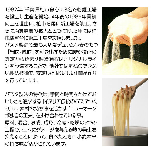 1982年、千葉県柏市藤心に3名で乾麺工場を設立生産を開始、4年後の1986年業績向上を理由に、柏市増尾に新工場を竣工、さらに消費需要の拡大とともに1993年には柏市増尾台に第二工場を設備しました。 パスタ製造で最も大切なデュラム小麦のもつ「旨味・風味」を引き出すために製粉技術の選定から始まり製造過程はオリジナルラインを設備することで、他社ではまねのできない製法技術で、安定した「おいしい」商品作りを行っています。安全・安心で信頼される商品の追求、「世界一おいしいパスタ」をお届けします。 ニューオークボ製法のこだわり カナダ産デュラム小麦100%使用デュラム小麦の中心核をセモリナ挽き(粗挽き)しました。 最高品質のデュラム小麦の豊かな風味ともちっとした食感が楽しめます。 自然に近い状態でゆっくり乾燥大量生産のオートメーションでは、短時間に麺を形成し高温乾燥させる為に、60℃~80℃もの高熱が加わります。これでは原料の旨みは失われてしまいます。 ニューオークボではなるべく熱が発生しないようデュラム小麦の練り込みからパスタの成型まで1回1回丁寧に時間をかけ作業しています。 最後の乾燥については、一般的な熱風ではなく38℃以下に温度管理された乾燥室で約72時間かけ自然に近い状態で低温で乾燥します。 水分をゆっくりと抜く事により小麦の風味が残り、またもっちりとした食感のパスタがうまれます。 ITEM INFORMATION 滑らかな口当たりと豊かな食感 素材の持ち味を活かして 造られたイタリアンスパゲッティ NEW OKUBO The CRAFT PASTA Italian SPAGHETTI ニューオークボ ザ クラフト パスタ イタリアン スパゲッティ 1.6mm 手間と時間をかけておいしさを追求する「イタリア伝統のパスタづくり」に、素材の持ち味を活かす「ニューオークボ独自の工夫」を掛け合わせて誕生したザ・クラフト・パスタ・イタリアン・スパゲッティ。 テフロンダイス仕上げにより滑らかな口当たりと豊かな食感が特徴のイタリアンスパゲッティです。 商品仕様・スペック 生産者ニューオークボ 生産地日本 タイプ乾燥ロングパスタ ゆで時間:7分前後 原材料デュラム小麦のセモリナ・食塩 内容量300g 保存方法高温多湿の場所、直射日光を避けて冷暗所に保存して下さい。 ※パスタの袋には小さい穴がいくつか開いています。この穴は製品中の空気を抜く目的で製造過程にて意図的に開けられたものです。
