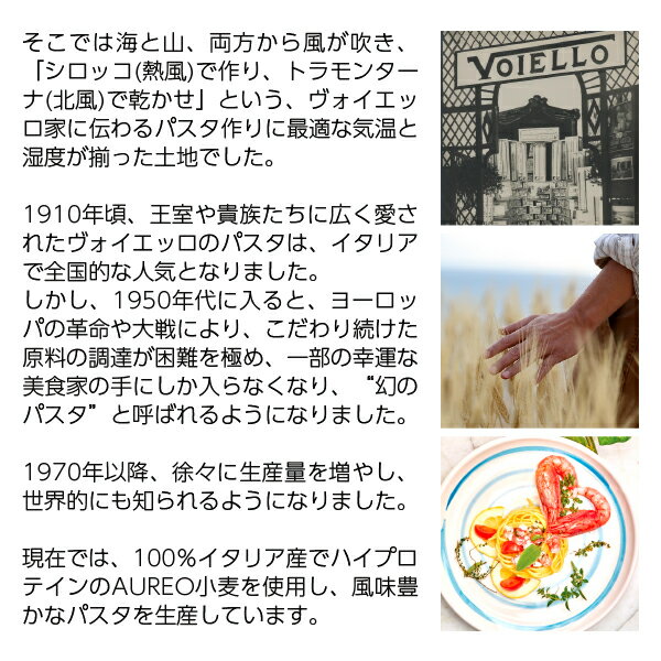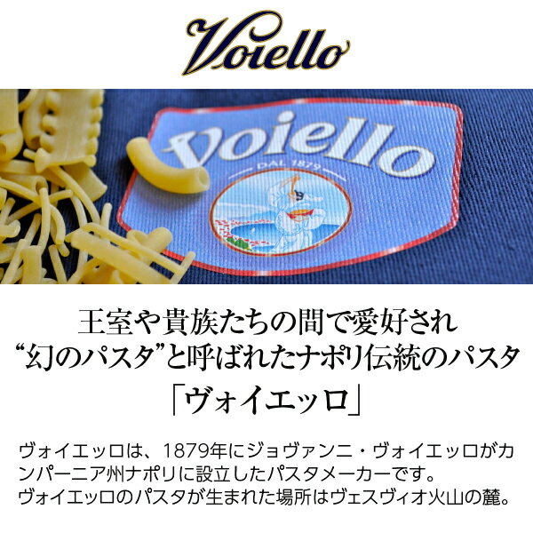 他の商品(食品以外)との同梱の送料に関しましては、ご注文確認メールにてお伝え致しますので、必ずご確認をお願いいたします。ヴォイエッロは、1879年にジョヴァンニ・ヴォイエッロがカンパーニア州ナポリに設立したパスタメーカーです。 ヴォイエッロのパスタが生まれた場所はヴェスヴィオ火山の麓。 そこでは海と山、両方から風が吹き、「シロッコ(熱風)で作り、トラモンターナ(北風)で乾かせ」という、ヴォイエッロ家に伝わるパスタ作りに最適な気温と湿度が揃った土地でした。 1910年頃、王室や貴族たちに広く愛されたヴォイエッロのパスタは、イタリアで全国的な人気となりました。 しかし、1950年代に入ると、ヨーロッパの革命や大戦により、こだわり続けた原料の調達が困難を極め、一部の幸運な美食家の手にしか入らなくなり、“幻のパスタ”と呼ばれるようになりました。 1970年以降になってようやく原料を安定的に調達できるようになり、徐々に生産量を増やし、世界的にも知られるようになりました。 現在では、長年の研究によって種苗会社と共同開発した100%イタリア産でハイプロテインのAUREO小麦を使用し、風味豊かなパスタを生産しています。 ITEM INFORMATION イタリア産AUREO小麦を使用 ナポリの典型的なパスタ お肉、お魚、どちらとも相性抜群! Voiello PACCHERI LISCI ヴォイエッロ パッケリ リッシ 種苗会社と共同開発した結果生まれた、100%イタリア産でハイプロテインのAUREO小麦を使用。 ナポリの典型的なパスタ、パッケリ。 パッケリは、「平手打ち」という意味で、茹でると平らになることからきています。 肉でも魚でも最高のパフォーマンスを発揮します。 商品仕様・スペック 生産者ヴォイエッロ 生産地イタリア タイプショートパスタ サイズ長/40mm、太/24.5mm ゆで時間14分前後 原材料100%イタリア産でハイプロテインのAUREO小麦 内容量500g ※パスタの袋には小さい穴がいくつか開いています。この穴は製品中の空気を抜く目的で製造過程にて意図的に開けられたものです。