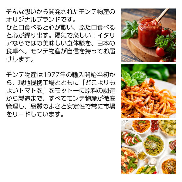 その美味しさは、本格派レストランから、家族が集う食卓まで。「イタリアット」は、"郷土色豊かなイタリアの本物の味わい、プロフェッショナル品質を、気軽にご家庭でもお楽しみいただきたい"。そんな想いから開発されたモンテ物産のオリジナルブランドです。 ひと口食べると心が歌い、ふた口食べると心が躍り出す。陽気で楽しい!イタリアならではの美味しい食体験を、日本の食卓へ。モンテ物産が自信を持ってお届けします。 モンテ物産は1977年の輸入開始当初から、現地提携工場とともに「どこよりもよいトマトを」をモットーに原料の調達から製造まで、すべてモンテ物産が徹底管理し、品質のよさと安定性で常に市場をリードしています。 本物のイタリアの味を追求した手軽なソースは、業務用、小売用を問わず根強い人気を誇り、自慢のトマトソースはシンプルな味つけで、イタリア産の完熟トマトのおいしさを生かしています。 乾麺は、パスタ製造の長い歴史を持つ南イタリア・カンパーニア州にて作られています。 テフロンダイス加工のなめらかな食感と豊かな小麦の香り、味わい、アルデンテの食感が特徴です。 ITEM INFORMATION パスタやピッツァなど用途は色々 南イタリアの家庭で作られている 昔ながらのトマトピューレ ITALI@ PASSATA RUSTICA イタリアット パッサータ ルスティカ 南イタリア産の完熟トマトを粗ごしのパッサータ(ピューレ)にしました。 イタリア語で「田舎風」を指すルスティカの名前通り、南イタリアの家庭で作られている昔ながらのトマトピューレで、まさにイタリアのノンナ(おばあちゃん)の味。 パスタやピッツァのソースなど、幅広くお使いいただけます。 商品仕様・スペック 生産者イタリアット 生産地イタリア 保存方法開封後は密閉して冷蔵庫で保存し、お早めにご使用ください。 タイプ粗ごしトマト 原材料トマト/クエン酸 内容量5000g(5kg)