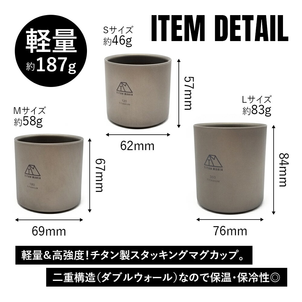 TITAN MANIA(チタンマニア)は、キャンプ・アウトドア好きの皆様に末永く愛用してもらえる高品質のキャンプギアを中心とした製品を大阪よりお届けするチタン製品専門ブランドです。 【商品詳細】 Sサイズ サイズ(約):57×62mm 重量(約):46g 容量(約):120ml Mサイズ サイズ(約):67×69mm 重量(約):58g 容量(約):180ml Lサイズ サイズ(約):84×76mm 重量(約):83g 容量(約):300ml 材質:チタン 【セット内容】 本体(Sサイズ/Mサイズ/Lサイズ)、収納袋 【商品説明】 超軽量!保温・保冷性に優れた二重構造。軽量で頑丈、スタッキングできるチタン製ダブルウォールマグカップ。温度変化が起きにくい二重構造のコップなので野外での食事におすすめ。チタンは嫌な金属臭がしないので飲み物の風味を損ないません。 積み重ねることで簡単に収納ができるスタッキンマグは、荷物を減らしたい・少なくしたいミニマムなウルトラライトキャンプにおすすめ。持ち運びに便利な通気性の良いメッシュ素材の収納袋付き。耐食性に優れたチタン製なのでサビてしまう心配がないので屋外での使用におすすめ。 マットな質感で手触りも良く、普段使いにも適しています。タンブラーやロックグラスとしてだけではなく取り皿や器としても使えます。軽量でコンパクトなのでソロキャンプ、釣りや登山、ハイキング、お花見やバーベキュー、バイクツーリングなど様々なアウトドアシーンで大活躍。■関連商品はこちらから スタッキングマグS(120ml) スタッキングマグM(180ml) スタッキングマグL(300ml) スタッキングマグLL(450ml) スタッキングマグ3点セット(S/M/L) スタッキングマグ4点セット(S/M/L/LL)