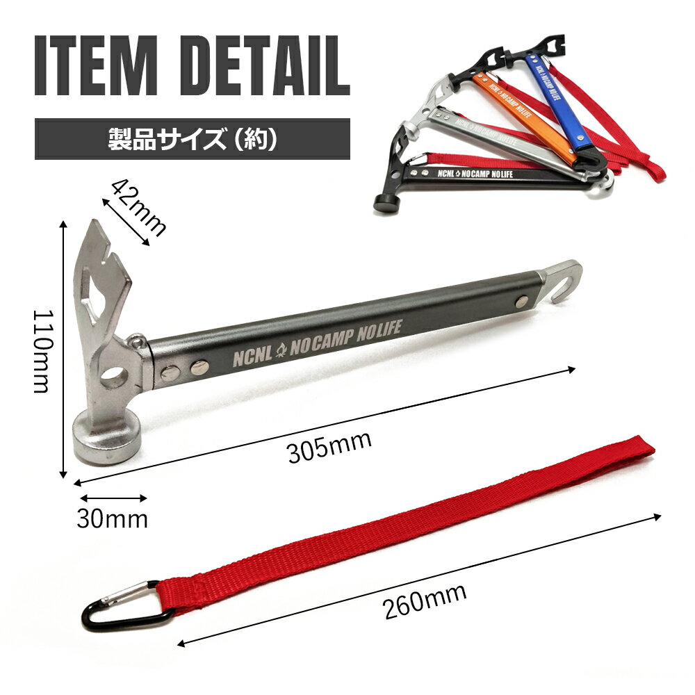 NCNL(NO CAMP NO LIFE)は、デザインや形状にこだわり過ぎて高価になり手が届かないような製品作りはしたくないと考えています。気兼ねなく普段使い出来る、身近にキャンプを感じてもらえるような「価格」「使いやすさ」を重視し、アウトドアを楽しむ全ての方々のお手伝いをする為、様々な商品を提供できるよう大阪より発信しております。 【商品詳細】 サイズ(約):110×305mm 重量(約):375g 材質:高炭素鋼(ヘッド/ペグ抜き)・アルミニウム合金(柄) 【セット内容】 本体(シルバー)、ストラップ 【商品説明】 ペグを打つ、ペグを抜く、土を掘るの3つの機能がひとつになった多機能ペグハンマー。すっぽ抜け防止のストラップ付き。ストラップを手首に巻きつけて使用すれば、ハンマーが遠くに飛んでしまう心配がありません。軽量で扱いやすいハンマーなので、荷物の重量をできるだけ軽くしたいソロキャンプや登山などにおすすめです。テントの設営、タープやシェードを固定するペグを打ち込むときはもちろん、DIYなど日常作業にも使えます。キャンプやアウトドアははじめ、様々なシーンで大活躍してくれます。 ヘッド部分は高炭素鋼製なので打ち込み時の衝撃を緩和してくれます。柔らかい地面にしっかり固定するのはもちろん、砂利や堅い地面でも気にせず打ち込めます。頭部の片側はクワ状のスコップになっているので、邪魔な石を取り除いたり、土や木の根の掘り起こしに使えます。 柄の下部がフック状になっているのでペグの穴やペグのフックに引っ掛けることで、ペグを簡単に引き抜くことが出来ます。ヘッドの中心部に丸穴が空いているので、ペグのフック部分を引っ掛けて抜くことも可能です。ペグ抜き用のフックとホールを使えば様々なタイプのペグを抜くことができます。■関連商品はこちらから 4WAY焚き火台 薪割り機(Sサイズ) 薪割り機(Lサイズ) ハンマー(ブラック) ハンマー(シルバー) ハンマー(ブルー) ハンマー(オレンジ) ジュートロープ 火吹き棒(イエロー) 火吹き棒(ブルー) 火吹き棒(ブラウン) 火吹き棒(グレー) 薪ばさみ(けやき) 薪ばさみ(ウォルナット)