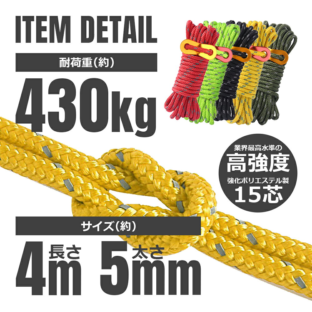 NCNL(NO CAMP NO LIFE)は、デザインや形状にこだわり過ぎて高価になり手が届かないような製品作りはしたくないと考えています。気兼ねなく普段使い出来る、身近にキャンプを感じてもらえるような「価格」「使いやすさ」を重視し、アウトドアを楽しむ全ての方々のお手伝いをする為、様々な商品を提供できるよう大阪より発信しております。 【商品詳細】 パラコード(ブラック) 太さ(約):5mm 長さ(約):4m 重量(約):69g 材質:強化ポリエステル 耐荷重(約):430kg 入数:10本 【商品説明】 強化ポリエステル製テントロープ。ロープにテンションをかけたいときなどに使う自在金具付き。業界最高水準の高強度で耐荷重は約430kg。太さ約5mmのパラコードなので頑丈、テントやタープをしっかりと固定します。引張強度が高く、ほつれや緩み、劣化にも強いので、安心してご使用いただけます。 ガイロープ選びは引っ張り力が強いものにすることが重要です。15芯のロープなので抜群の耐久性を実現しました。ガイドの両端は、ほつれてしまわないようにヒートカット加工をしています。反射材入りなのでわずかな光でも視認性を高めることができます。夜間のつまづき防止にも。 ペグやペグハンマーと一緒に持ち運べる便利な収納袋付き。軽量でコンパクトでバックパッキングしやすいサイズなのでソロキャンプや登山などのウルトラライトキャンプをはじめ、ハイキング、お花見やバーベキュー、バイクツーリング、釣りなど様々なアウトドアシーンで大活躍!■関連商品はこちらから パラコード レッド 6本セット 8本セット 10本セット 12本セット グリーン 6本セット 8本セット 10本セット 12本セット ブラック 6本セット 8本セット 10本セット 12本セット イエロー 6本セット 8本セット 10本セット 12本セット オリーブ 6本セット 8本セット 10本セット 12本セット