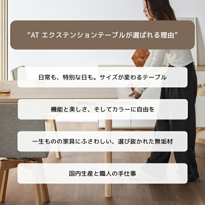 商品名 AT エクステンションテーブル(120サイズ) サイズ 幅:1200~1800 (mm) 奥行:850 高さ:720 (mm) カラー 1. グレージュ 2. ベージュ 3. スノーホワイト 4. アッシュ 5. アッシュ × グレージュ 6. アッシュ × ベージュ 7. アッシュ × スノーホワイト 素材 ■ 天板:メラミン化粧板 ■ 天板縁:無垢材(アッシュ 3mm) ■ 脚・幕板:無垢材(アッシュ) ■ 仕上げ:オイル塗装 梱包サイズ ※天板・脚の2個口梱包となります。 【脚】幅:770 奥行:240 高さ:180 (mm) 【天板】 幅:1280 奥行:930 高さ:170 (mm) 生産国 日本 その他 ・天板片側1枚伸長で+300mm。 ・天板両側2枚伸長で+600mmとなります。 備考 ※天板と脚の2個口でのお届けとなります。 ・モニターの発色具合によって実際のものと色が異なる場合があります。 ・離島・一部地域は追加送料がかかる場合があります。ウォールナットはこちら ダイニングテーブルはこちら