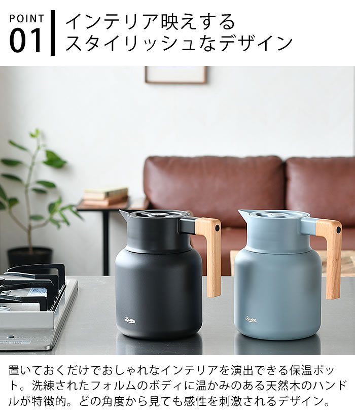 商品名リバーズ サーモジャグ キート 1600関連商品→リバーズ サーモジャグ キート 1200→リバーズ サーモジャグ キート 1600商品詳細サイズ約 W20.5×D14.5xH21cm重量約840g容量約1600ml素材【本体】18-8ステンレス鋼・ポリプロピレン・【フタ】18-8ステンレス鋼・ポリプロピレン・ポリアセタール・シリコーンゴム【ハンドル】ビーチウッド・シリコーンゴム・ステンレス鋼(ハンドル軸)保温・保冷効力【保温】56℃以上(10時間)【保冷】7℃以下(6時間)備考※絶対に火にかけないで下さい。※コンロなどの火気に近づけないで下さい。※電子レンジやオーブンではお使いいただけません。※食器洗浄機や食器乾燥機はお使いいただけません。※パーツごとにお手入れ方法が異なります。【絶対入れてはいけないもの】炭酸飲料やドライアイス味噌汁やスープなど塩分を多く含んだもの牛乳や乳飲料、果汁などお茶の葉、果肉など【木製ハンドルについて】ハンドル部分は天然木を使用しています。剥がれにくいコーティングが施されていますが、水にぬれると吸水して膨張したりコーティングが剥がれやすくなったり木にダメージを与えることがありますので洗浄の際は水がかからない様に注意していただき、もし濡れた時は布で拭き取り十分に乾燥させてください。検索キーワード リバーズ サーモジャグ キート 1600ml 魔法瓶 保冷保温ポット ステンレス製 真空二重構造 卓上ポット コーヒーポット 真空断熱ポット バキュームジャグ おしゃれ アウトドア 北欧 レトロ RIVERSラッピングラッピングOK→詳細はこちらリバーズ サーモジャグ キート 1600大容量卓上保温ポット1600mlキャンプやアウトドアで大活躍リバーズのドリンクウェアシリーズから「サーモジャグ キート 1600ml」が登場。真空二重構造のデザイン性の高い保温ポット。天然木のハンドルや直線的なフォルムなど、どの角度から見てもスタイリッシュな仕上がり。ハンドルの塗装も改良されて?がれにくくなりました。頑丈なダブルウォールステンレスなのでアウトドアでも大活躍。幅広設計で奥まで洗浄しやすくメンテナンス面でも安心して使えます。木製ハンドルとスモーキーカラーの配色がとてもおしゃれです。【保温効力】10時間で64.4℃以上 【保冷効力】6時間で6.3℃以下シリーズ一覧を見る