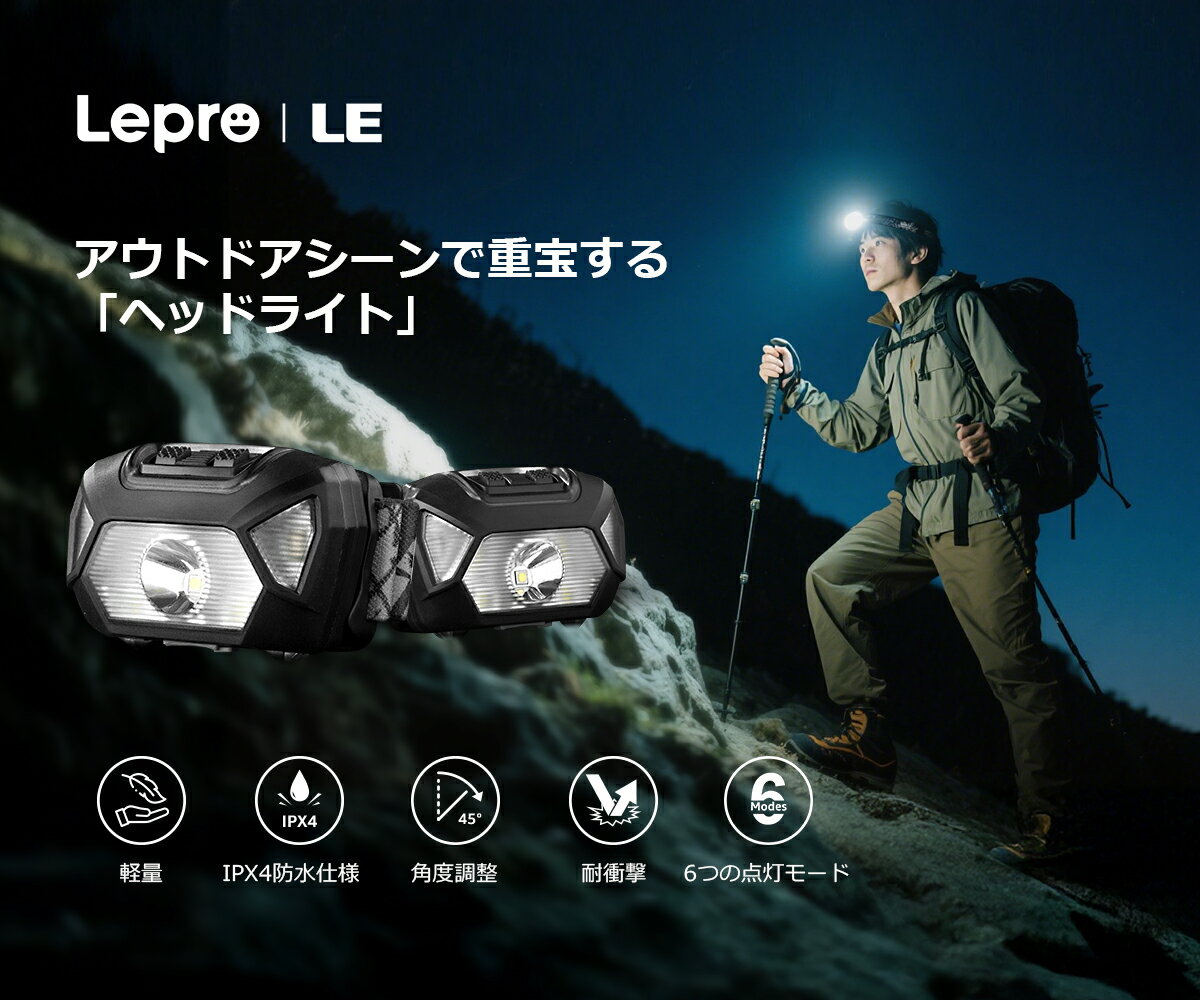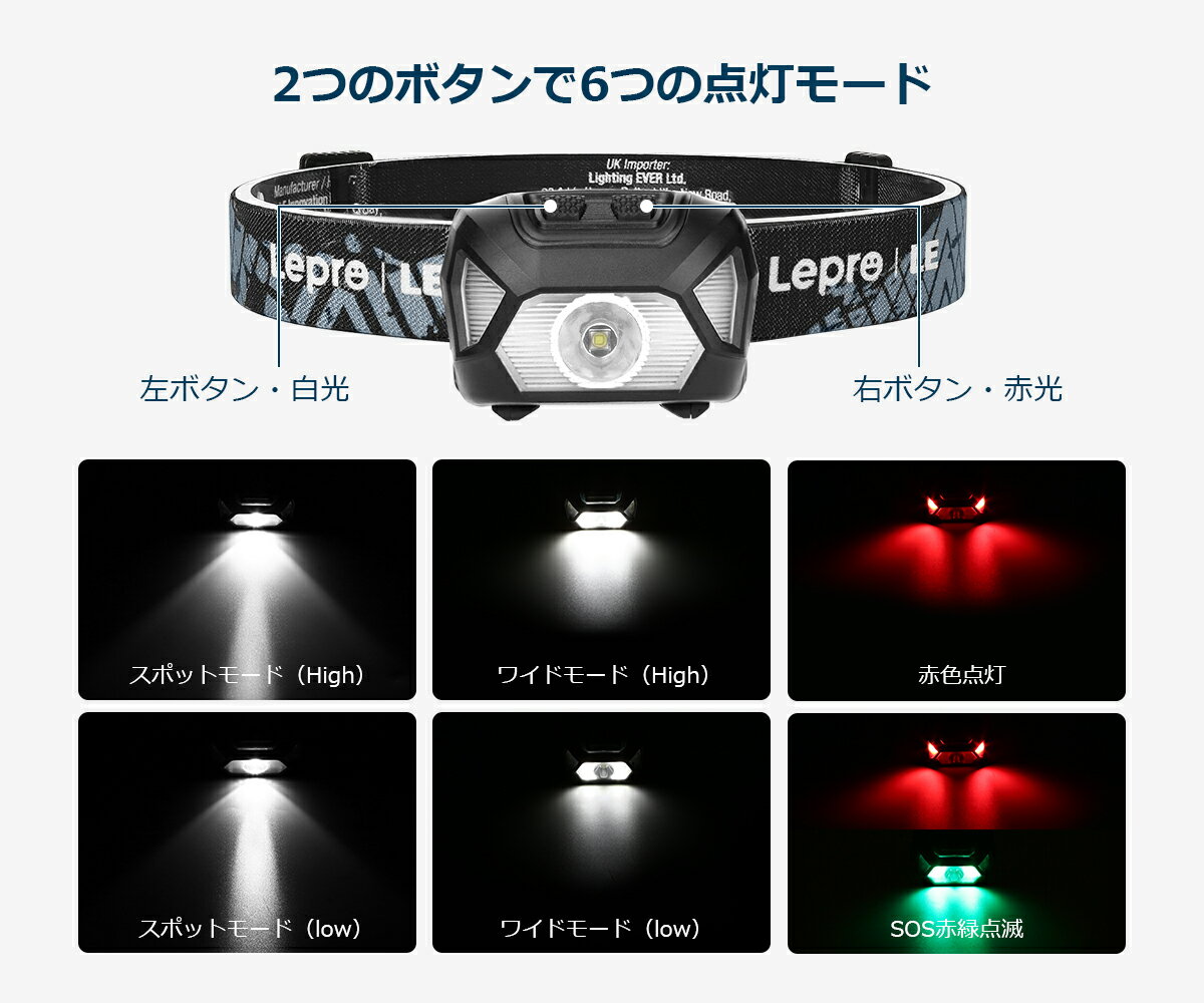 メーカー希望小売価格はメーカーサイトに基づいて掲載しています。ヘッドライト 充電式 、乾電池式 USB 高輝度 ヘッドランプ 2個セット 集光・散光切替 明るさ300ルーメン・200ルーメン/赤色ライト搭載★ 明るさの数値については、積分球と分光測定器を用いて測定した結果です。●簡単な操作:二つのボタンで操作!充電式:左ボタン:白光の4つのモードを切り替えスポットHigh→スポットLow→ワイドHigh→ワイドLowスポットモード:High/4時間、Low/12時間ワイドモード:High/5時間、Low/15時間右ボタン:赤色点灯とSOS赤緑点滅切り替え赤色点灯とSOS赤緑点滅:実行点灯15時間電池式:左ボタン:白光の4つのモードを切り替えスポットHigh→スポットLow→ワイドHigh→ワイドLowスポットモード:High/6時間、Low/19時間ワイドモード:High/7時間、Low/22時間右ボタン:赤色点灯とSOS赤緑点滅切り替え赤色点灯とSOS赤緑点滅:実行点灯22時間。赤色LEDライトは、雨・霧などの悪天候でも視認性が良く、遠くからでも確認しやすくなり、事故防止に役立ちます。●『充電式』おすすめの用途: ●キャンプ ●登山 ●お釣り ●ジョギング ●夜の散歩 ●停電・災害 暗い現場での作業はもちろん、キャンプや登山、釣りといったアウトドアでも重宝されています。●↓↓【Leproヘッドライト特集ページ】↓↓