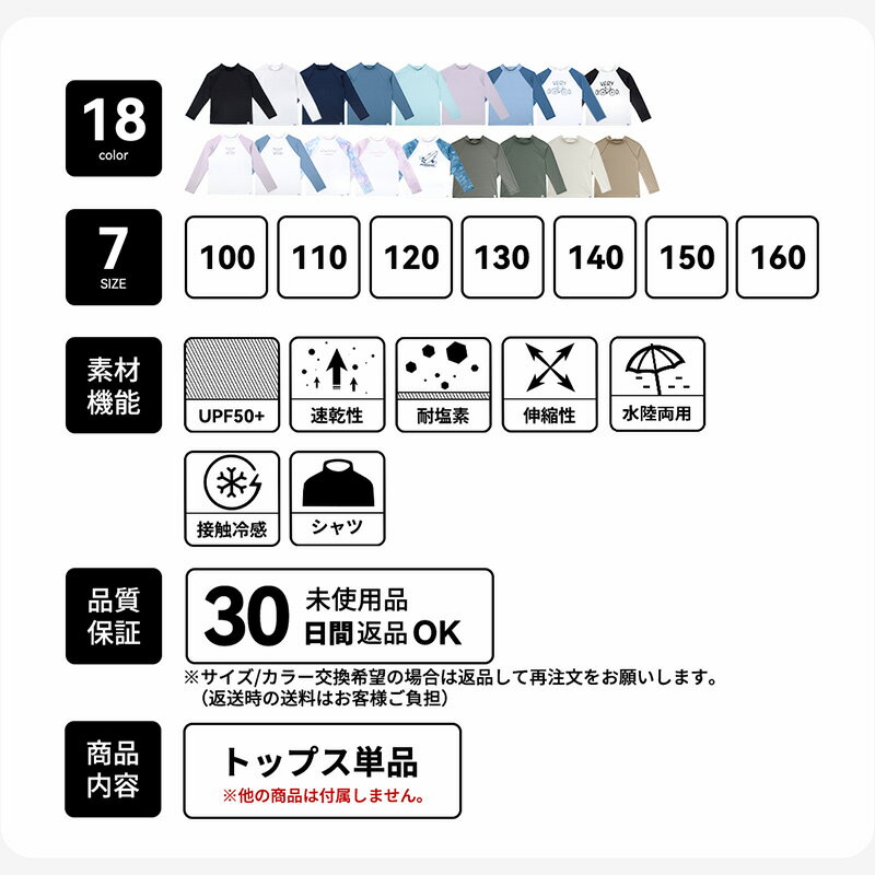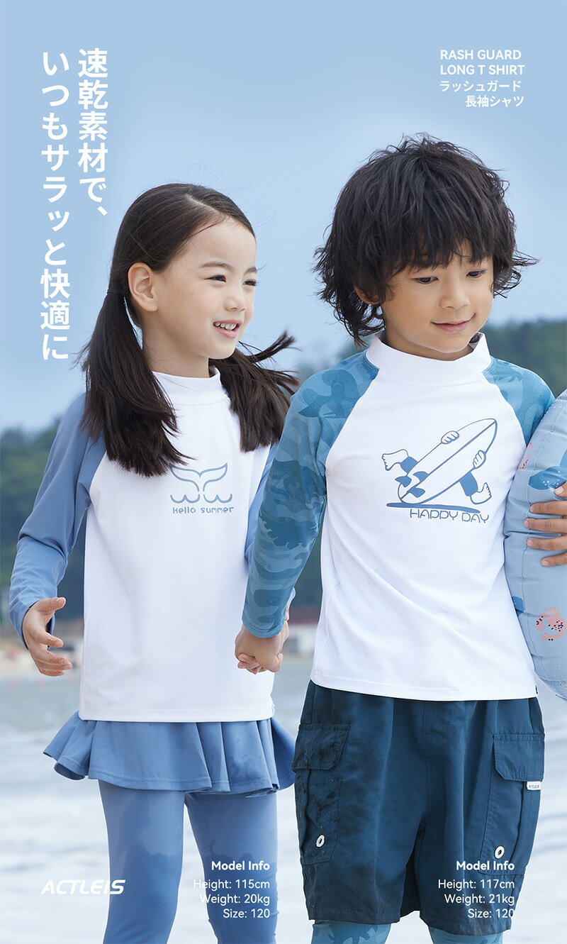 ※お客様のモニターの環境によって色が異なって見える場合がございます。 【商品名】 ラッシュガード キッズ 長袖 かぶり シャツ tシャツ こちらの商品は「トップス単品」です。 ※他の商品は付属しませんのでご注意ください。 【ブランド名】 Actleis アクレイス 【商品コード】 al23020 【商品説明】 18色から選べる豊富なカラーバリエーション 海やプールなどの水遊びからタウンユースまでOK 速乾性に優れた素材なので不快感なく着用いただけます。 【商品カテゴリ】 マリン>ラッシュガード>キッズラッシュガード>長袖シャツ 【カラーバリエーション】 ブラック、ホワイト、ネイビー、ブルー、ピンク、パープル、ブラウン、グレー、グレージュ、ベージュ、グリーン 【サイズ展開】 100・110・120・130・140・150・160 【関連用語】 男女兼用 男の子 女の子 男子 女子 男児 女児 ジュニア 子供 子ども こども プール 海 海水浴 uvカット水陸両用 紫外線対策 日焼け予防 upf50+