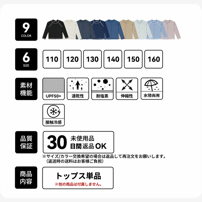 ※お客様のモニターの環境によって色が異なって見える場合がございます。 【商品名】 ラッシュガード キッズ スクール 長袖 スクール水着 フードなし フード無し ポケット ジップアップ こちらの商品は「トップス単品」です。 ※他の商品は付属しませんのでご注意ください。 【ブランド名】 Actleis アクレイス 【商品コード】 al25059 【商品説明】 9色から選べる豊富なカラーバリエーション 学校のプール授業でも大活躍 海やプールなどの水遊びからタウンユースまでOK 速乾性に優れた素材なので不快感なく着用いただけます。 【商品カテゴリ】 マリン>ラッシュガード>キッズラッシュガード>ジップアップ(フード無し) 【カラーバリエーション】 ブラック、ホワイト、グレー、ネイビー、ブルー、グレージュ、ベージュ、グリーン、ブルー、ピンク 【サイズ展開】 110・120・130・140・150・160 【関連用語】 男女兼用 男の子 女の子 男子 女子 男児 女児 ジュニア 子供 子ども こども 小学生 中学生 学校 小学校 中学校 学校用 プール 海 海水浴 uvカット水陸両用 紫外線対策 日焼け予防 upf50+