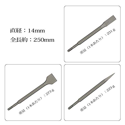 ◆商品名:充電式ハンマードリル チゼル SDS プラス シャンク ドリル SDS ビット プラス シャンク コンクリート タガネ 工具 全長 250mm 45crタングステン鋼 レンガ 切断 はがし バリ取り ハツリ 作業 チゼル 【3本セット】Mrupoo ■重量:0.73 kg ■有効長:250mm ■材質:45crタングステン鋼 ■フラットチゼル ポイントチゼル コールドチゼル(合わせて3本) ■平タガネ(フラットチゼル/コールドチゼル) 直経:14mm 全長約250mm 重量(1本あたり):273 g ■チスタガネ(ポイントチゼル/ブルポイント) 直経:14mm 全長約250mm 重量(1本あたり):223 g ■平タガネ(フラットチゼル/コールドチゼル) 直経:14mm 全長約250mm 重量(1本あたり):231 g コンクリート・ブロック・レンガ・モルタル・スレート・ALC・レンガ・日本壁・大理石・陶器タイルなどあらゆる構造物へのハツリ、破砕、溝切り、角出し作業に適合します! ポイントチゼル:常にパワフルな破砕力を確保しており、様々な建造物のハツリに使用が可能です。コールドチゼル:強力な粉砕力を持ち、あらゆる建造物へのハツリ・粉砕・溝堀・角出すことが可能です。フラットチゼル:硬いブロックや煉瓦割りをする時などPタイルやラインの剥し作業に最適。 ご注意:チゼルをテコ等として力の打撃方向と相違ある方向に無理な力が掛かりますとチゼルの折損や曲がりの原因とる場合がありますのでご注意ください。