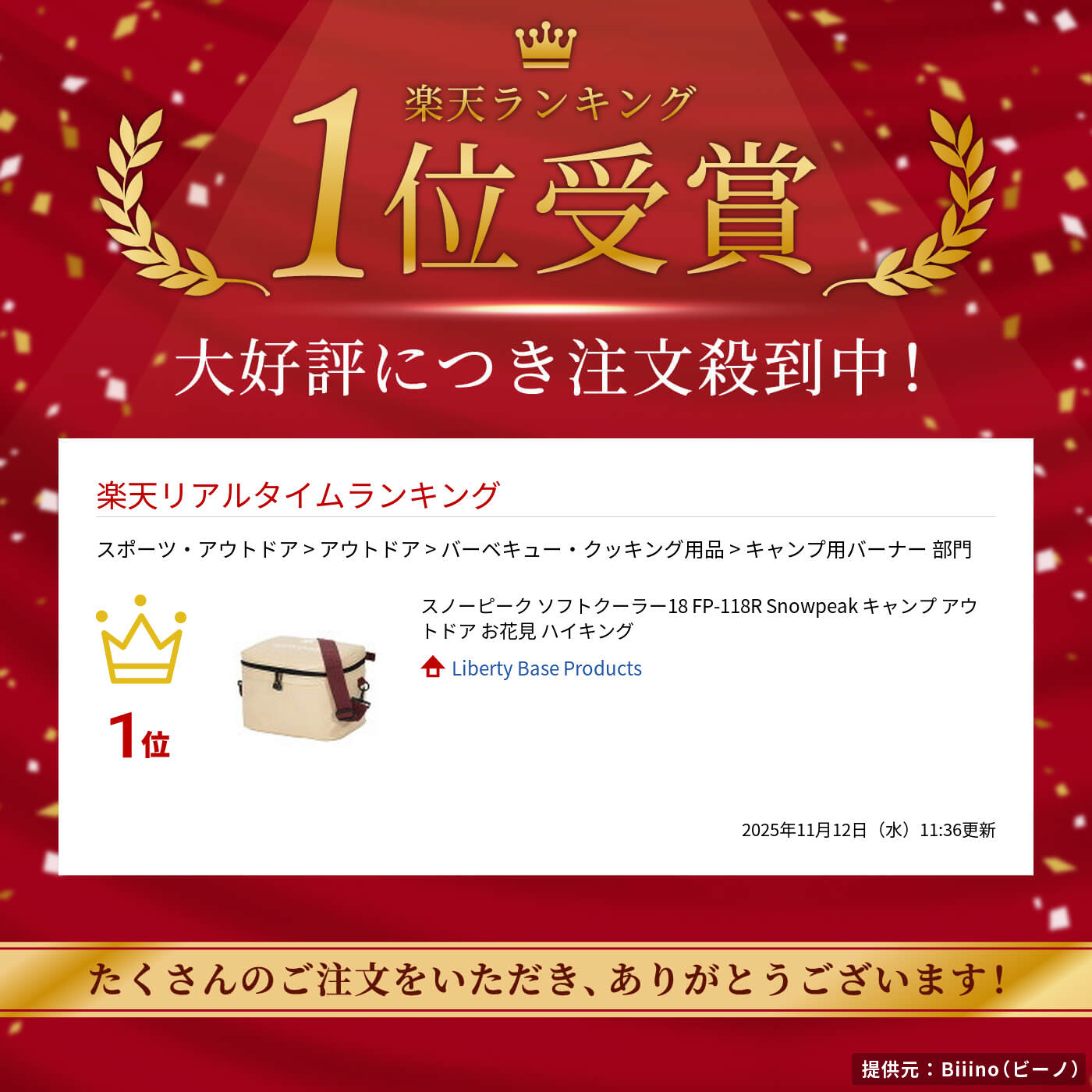 仕様サイズ:345×245×230(h)mm 材質: 外側:PVC+ポリエステル 断熱材:発泡ポリエチレン+ミラー加工 内側:PVCシート その他:ポリプロピレン、樹脂、スチール 重量:800g 容量:18L 注意事項モニターの発色によって色が異なって見える場合がございます。Snowpeak スノーピーク ソフトクーラー18 FP-118R汎用性の高いサイズの18Lモデル 肩にかけてちょうど良いサイズです。持ち歩くのはもちろん、テーブルサイドやチェアの脇に置いてもいいサイズです。カメラやAV機器を入れるのにも適しています。ソフトクーラー18には550mlタイプのペットボトルが15本収納できます。 断熱材にはアルミコーティングエアシェル内層材を使用しています。 内部に冷気を保冷したまま熱を外部に跳ね返す構造です。 アウターにPVCナイロンを採用し熱や衝撃に対応します。 ソフトクーラーの各部分の溶接部には超音波溶着が施されており、溶接部から水が漏れることはありません。