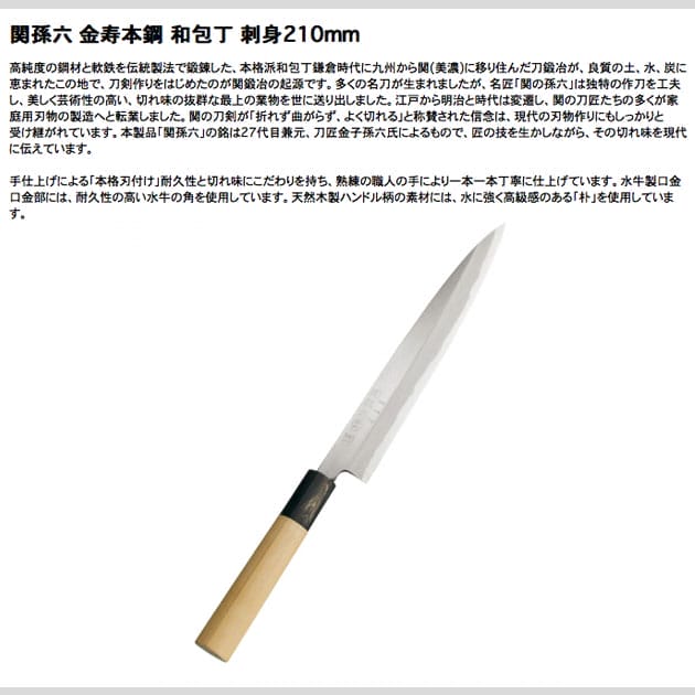 貝印 関孫六 金寿本鋼 和包丁 刺身210mm AK-5219 関孫六 金寿本鋼シリーズ。 高純度の鋼材と軟鉄を伝統製法で鍛錬した、本格派和包丁鎌倉時代に九州から関(美濃)に移り住んだ刀鍛冶が、良質の土、水、炭に恵まれたこの地で、刀剣作りをはじめたのが関鍛冶の起源です。 多くの名刀が生まれましたが、名匠「関の孫六」は独特の作刀を工夫し、美しく芸術性の高い、切れ味の抜群な最上の業物を世に送り出しました。 江戸から明治と時代は変遷し、関の刀匠たちの多くが家庭用刃物の製造へと転業しました。 関の刀剣が「折れず曲がらず、よく切れる」と称賛された信念は、現代の刃物作りにもしっかりと受け継がれています。 本製品「関孫六」の銘は27代目兼元、刀匠金子孫六氏によるもので、匠の技を生かしながら、その切れ味を現代に伝えています。 手仕上げによる「本格刃付け」耐久性と切れ味にこだわりを持ち、熟練の職人の手により一本一本丁寧に仕上げています。 水牛製口金口金部には、耐久性の高い水牛の角を使用しています。 天然木製ハンドル柄の素材には、水に強く高級感のある「朴」を使用しています。 商品名 貝印 関孫六金寿本鋼 和包丁 刺身210mm AK-5219 本体サイズ 343×33×17mm 重量 127g 材質 ■刀身/切り刃…特殊炭素鋼(刃付形状…片刃)、側金…軟鉄 ■口金…水牛 ■柄…天然木 広告文責 株式会社ルーマニア/03-5876-8107