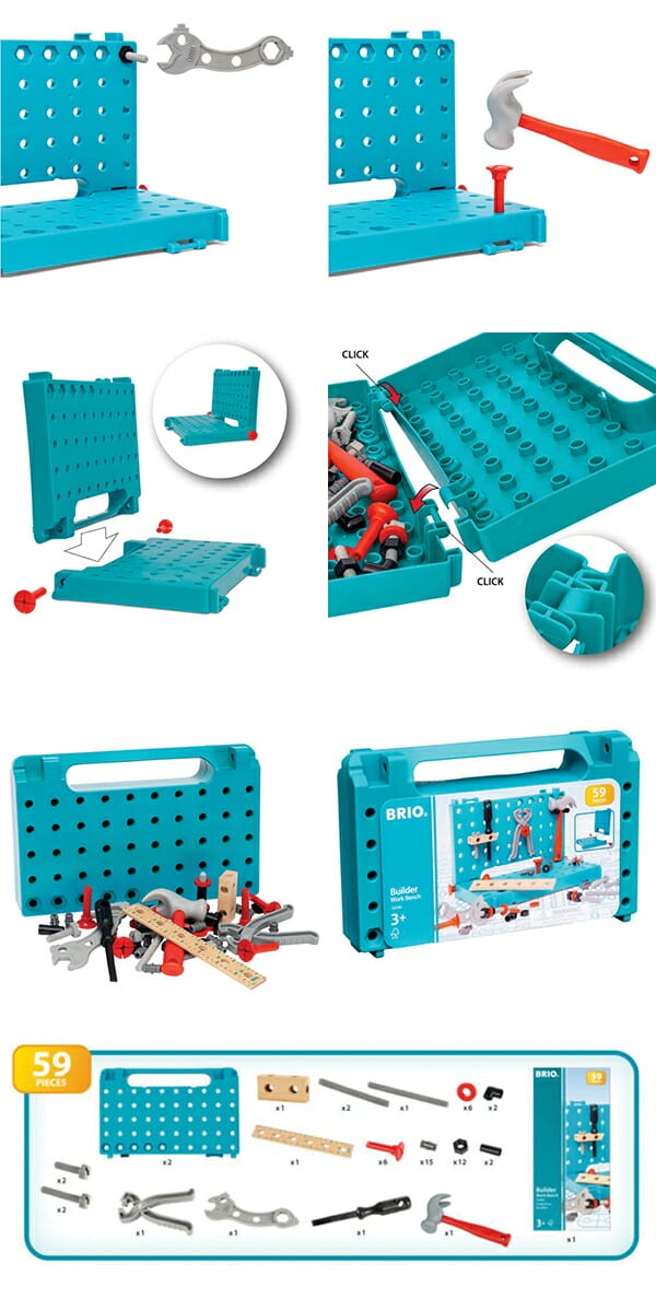 BRIO ブリオ ビルダー ワーキングベンチ 34596 物づくりが好きなお子さまにぴったりの入門ツール BRIO ビルダーのワーキングベンチを使ってハンマーで叩いたり、ネジを回して固定しよう。 この組み立て玩具は、物づくりが好きなお子さまにぴったりの入門ツールです。 このフレキシブルなワーキングベンチにより、お子さまはハンマー、レンチ、ドライバーなどのツールを使用して、創造的かつ自由な方法で道具を使う練習することができます。 遊び終えたら、ベンチを折りたたむだけで便利なツールボックスになり、スマートに収納できます。 ビルダーワークベンチに含まれる 59 個のピースは、ワークベンチ / ツールボックス 1個、ハンマー 1個、ドライバー 1個、ペンチ 1個、レンチ 1個、定規 1個、組み立て部品 52個、取扱説明書 1冊です。 パッケージサイズ 65x200mm 素材 ウッド, ポリプロピレン 対象年齢 3歳〜 広告文責 株式会社ルーマニア/03-5876-8107 【メーカー:BRIO ブリオ】