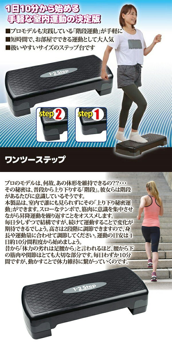 後藤 ワンツーステップ プロモデルも実践している「階段運動」が手軽に ●1日10分から始める手軽な室内運動の決定版 ●プロモデルも実践している「階段運動」が手軽に ●短時間で、お部屋でできる運動として大人気 ●扱いやすいサイズのステップ台です 商品名 後藤ワンツーステップ サイズ 約幅69×奥行29cm×高さ10、15cm(2段階調節可能) 重量 約2.3kg 材質 ポリプロピレン 仕様 耐荷重/120kg 生産国 台湾 販売元 株式会社後藤 広告文責 株式会社ルーマニア/03-5876-8107