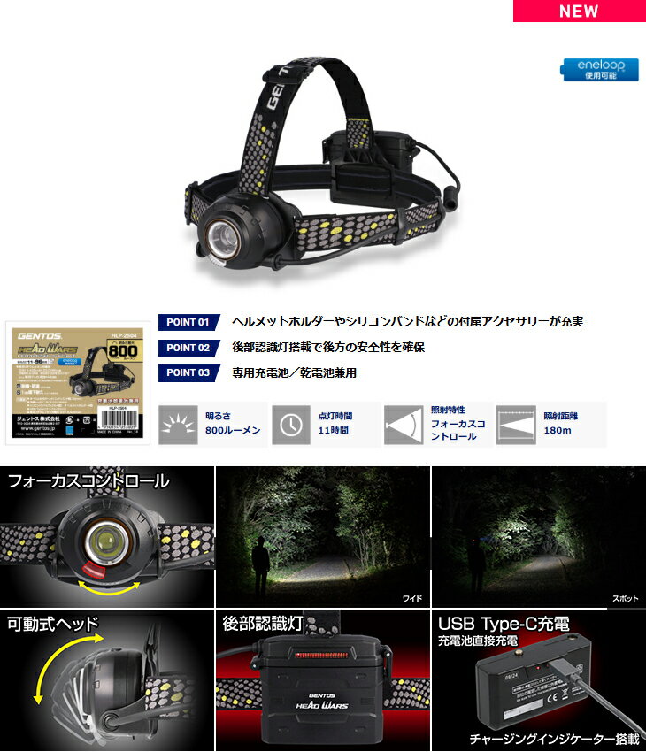 【数量限定】【在庫あり】【即納】 ジェントス HLP-2504 ヘッドライト 800ルーメン 最大96時間点灯 充電式 乾電池式 兼用 照射最大180m 耐塵・防滴(IP64準拠) 1m落下耐久 LED おしゃれ 作業灯 ワークライト ライト ランプ 軽量 防災 GENTOS HEAD WARSシリーズ