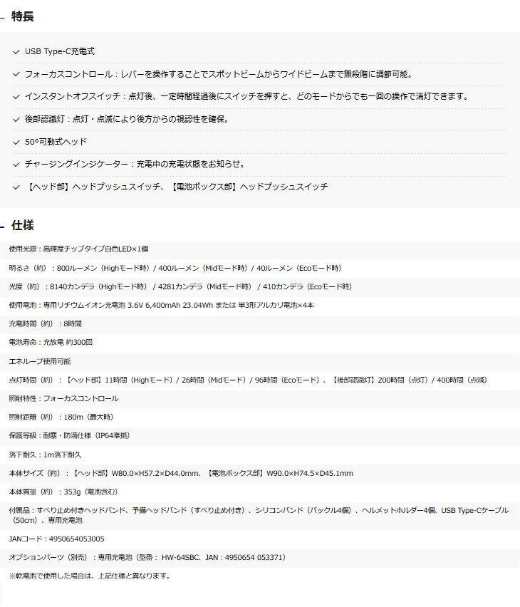 ●最大点灯時間は約96時間。※Ecoモード時 ●バッテリーは単3電池だけでなく、付属の専用充電池や充電が可能な乾電池(エネループ)を使えば充電式としても使える。 ●USB充電式。 ●フォーカスコントロール:レバーを操作することでスポットビームからワイドビームまで無段階に調節可能。 ●インスタントオフスイッチ:点灯後、一定時間経過後にスイッチを押すと、どのモードからでも一回の操作で消灯できます。 ●後部認識灯:点灯・点滅により後方からの視認性を確保。 ●50°可動式ヘッド。 ●チャージングインジケーター:充電中の充電状態をお知らせ。 ●【ヘッド部】ヘッドプッシュスイッチ、【電池ボックス部】ヘッドプッシュスイッチ ●防塵・防滴(IP64準拠)&1m落下耐久。 ●ご家庭用、業務用問わず大活躍する人気シリーズ。 ●作業現場、工事現場、工場や施設、その他屋内・屋外探索など、暗い場所に最適。 ●バーベキューやキャンプなどのアウトドアだけでなく、非常時や防災用としても人気。 ●シンプルな設計なので、お手入れかんたん。 ●価格コムで上位ランキング獲得。 ●雑誌やブログで人気!おしゃれ。プレゼント、ギフトにもおすすめ。 ■仕様 ・使用光源:高輝度チップタイプ白色LED×1個 ・明るさ(約): 800ルーメン(Highモード時) 400ルーメン(Midモード時) 40ルーメン(Ecoモード時) ・光度(約): 8140カンデラ(Highモード時) 4281カンデラ(Midモード時) 410カンデラ(Ecoモード時) ・使用電池:専用リチウムイオン充電池 3.6V 6,400mAh 23.04Wh または 単3形アルカリ電池×4本 ・充電時間(約):8時間 ・電池寿命:充放電 約300回 ・エネループ使用可能 ・点灯時間(約): 【ヘッド部】11時間(Highモード)/ 26時間(Midモード)/ 96時間(Ecoモード) 【後部認識灯】200時間(点灯)/ 400時間(点滅) ・照射特性:フォーカスコントロール ・照射距離(約):180m(最大時) ・保護等級:耐塵・防滴仕様(IP64準拠) ・落下耐久:1m落下耐久 ・本体サイズ(約): 【ヘッド部】W80.0×H57.2×D44.0mm 【電池ボックス部】W90.0×H74.5×D45.1mm ・本体質量(約):353g(電池含む) ・付属品:すべり止め付きヘッドバンド、予備ヘッドバンド(すべり止め付き)、シリコンバンド(バックル4個)、ヘルメットホルダー4個、USB Type-Cケーブル(50cm)、専用充電池 ・JANコード:4950654053005 ・オプションパーツ(別売):専用充電池(型番: HW-64SBC、JAN:4950654 053371) ※乾電池で使用した場合は、上記仕様と異なります。 (2WAY 2way HLP-2504 HLP2504 充電型 新作 電車 夜間作業 夜間工事 保守作業 夜間重機械作業 鉄道工事 釣り 夜釣り 電池交換 防災用品 防災グッズ 防災グッツ 防災セット 震災 地震 災害 火災 停電 キャンプ バーベキュー BBQ アウトドア 野外 フェス 釣り 登山 整備 工場 倉庫 業務用 家庭用 小型 コンパクト 人気 ランキング プレゼント ギフト 景品 おまけ 火事 火災 震災 災害 地震 避難 高性能 じぇんとす GENTOS ledランタン ランタン こんぱくとさぎょうとうシリーズ こんぱくとさぎょうとうしりーず 強力 最強 防水 安心 安全)【ジェントス ヘッドライト 800ルーメン】