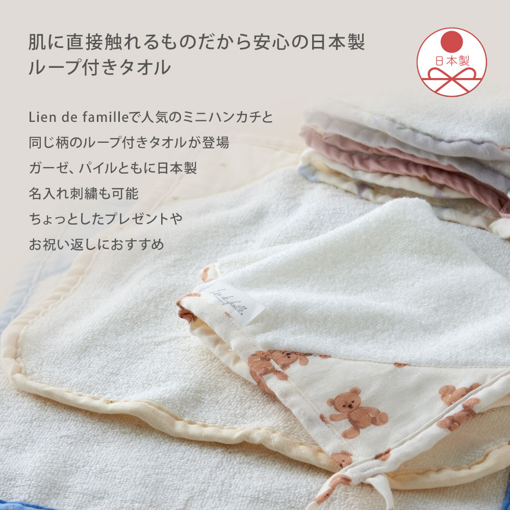 |名入れ無料|日本製 ループ付き タオル 名入れ 刺繍 ネームタグ付き 綿 100% ループタオル 内祝い ハンドタオル 女の子 男の子 お名前タグ 保育園 幼稚園 御祝 通園 通学 出産祝い プレゼント ギフト Lien de famille