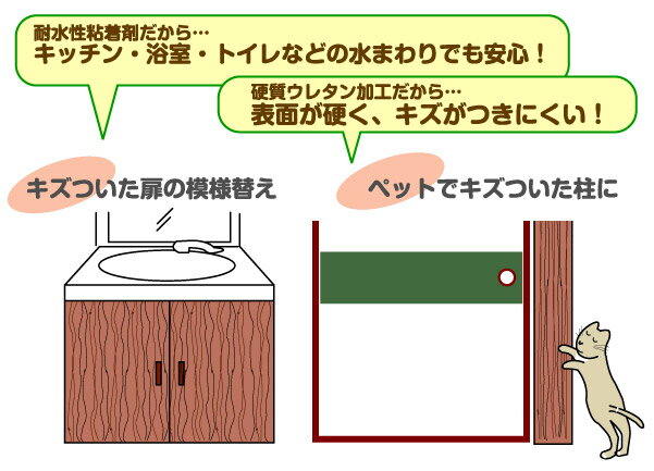 「硬質ウレタン加工」で、表面が硬く、傷がつきにくく汚れにくい。洗剤で簡単拭き取り。「抗菌加工」で、カビや雑菌を防ぎます。※凸凹のある面・ザラザラしている面は貼れません。※天井や屋外には使用しないで下さい。※シリコン・フッ素・テフロン樹脂等、特殊加工された合板には貼れません。●強力な接着剤のため、圧着の後貼り直すと、モルタル・シックイ・撥水の弱いプリント合板などの表面がはがれる恐れがあります。●この商品は紙製品なので、はがすときに破れる恐れがありますので、ゆっくりとはがして下さい。