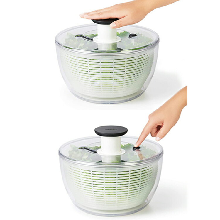 商 品 詳 細 OXOの人気No1サラダスピナー。 片手でノブを押すだけでカゴが回転して簡単に野菜の水切りができる構造はそのままに、大きめで押しやすく、さらに効きが良くなった特許取得のブレーキボタンや、ノブを収納したままノブを持ってフタを開閉できる形で、より快適に水切りができます。 やわらかく濡れた手でも滑りにくいノブは、よりフラットになり手になじみやすくなりました。 底面には滑り止めがついていて、回転中もしっかり安定してストレスがありません。 ノブを下げて固定すればフラットになるフタは、場所を取らず上に物を載せて収納も可能です。 上から中身を確認できるクリアなフタは、内側のフタが簡単に取り外せてお手入れ可能。 洗練されたデザインで、水切りした野菜をボウルに入れて食卓でサービングしたり、フタをしてそのまま冷蔵庫で保存もできて便利です。 ※漂白剤はご使用いただけません(ボウル、バスケットは可)。 ※食器洗い乾燥機(低温設定)がご使用いただけます。 サイズ 約 縦27 × 横27 × 高さ20.5cm(ノブを下げた状態の高さ:15.5cm) 本体重量 約1208g 材質 容器:AS樹脂、フタ:ABS樹脂・ポリアセタール・ステンレス鋼、プレート:ポリプロピレン、パッキン:シリコーンゴム 原産国 中国クリアサラダスピナー 大 ワンタッチで野菜を簡単水切り ワンタッチで簡単水切り 片手でノブを押すだけでカゴが回転し、野菜を簡単水切り。しっかりと水の切れた美味しいサラダが素早く完成します。 ブレーキボタンを押せば、ぴたっと回転を止めることも可能です。 底面には滑り止めがついていて、回転中もしっかり安定してストレスがありません。 サラダボウルとして ザルとボウルはそれぞれ別に使う事もできて便利。ボウルはクリアでスタイリッシュなデザインなので、単品でもお使いいただけます。 野菜を水切り後、そのまま食卓に出せば時短にもなります。 お手入れ簡単 内蓋は引っ張るだけで簡単に外せてお手入れも簡単。食器洗い乾燥機(低温設定)の使用も可能で、清潔にお使いいただけます。 すっきり収納 ノブはフラットになるので、収納時にもかさ張りません。冷蔵庫に入れやすく、蓋の上に物を重ねる事もできます。
