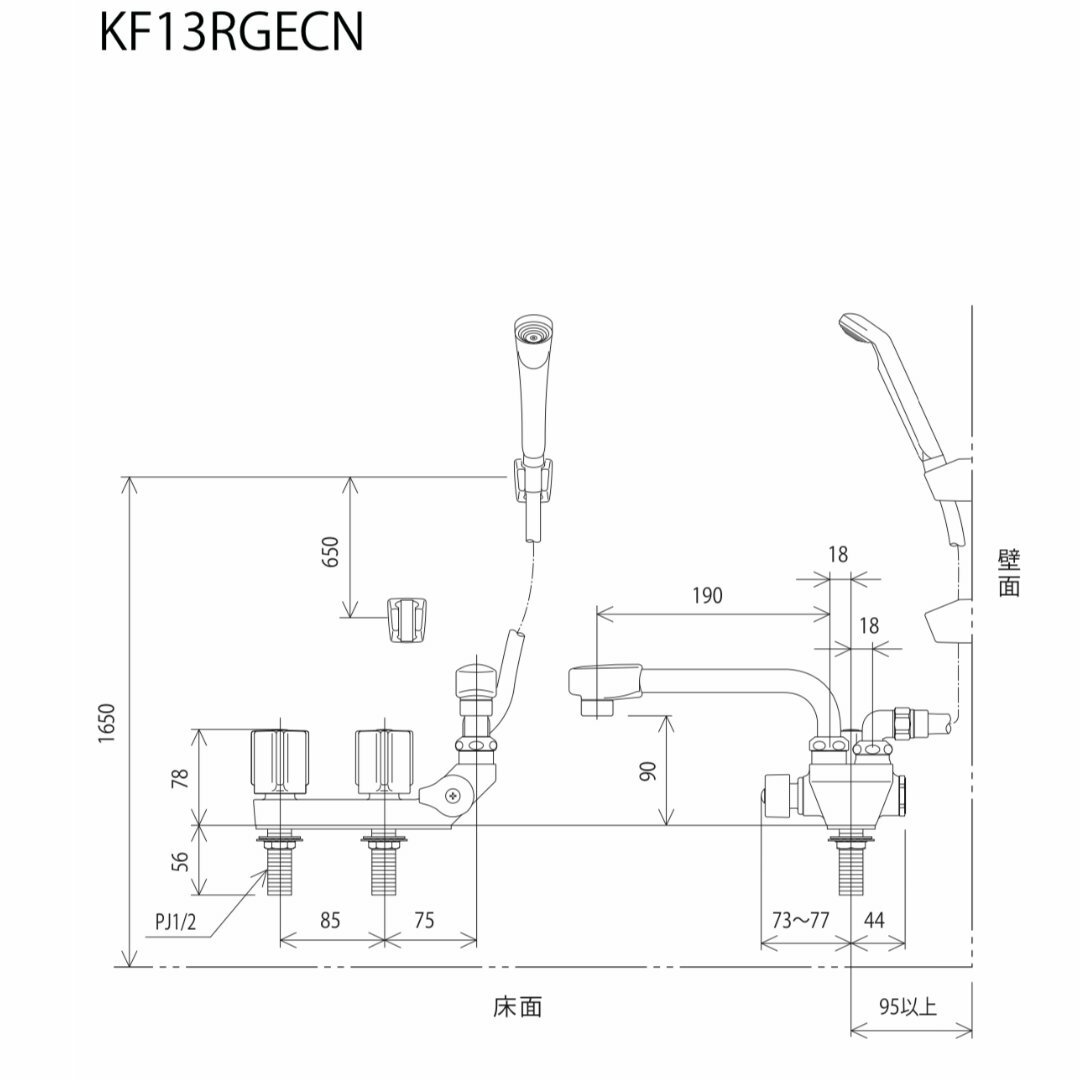商品情報注意事項モニターの発色の具合によって実際のものと色が異なる場合がございます。【限定在庫】KVK KF13RGECN デッキ型2ハンドルシャワー(右側シャワー) 190mmパイプ付 取付ピッチ85mm シャワーホース白1.45m 白ハンガー 吐水口長さ190mm 混合水栓 湯水 デッキ型の2ハンドル混合シャワー水栓。 7