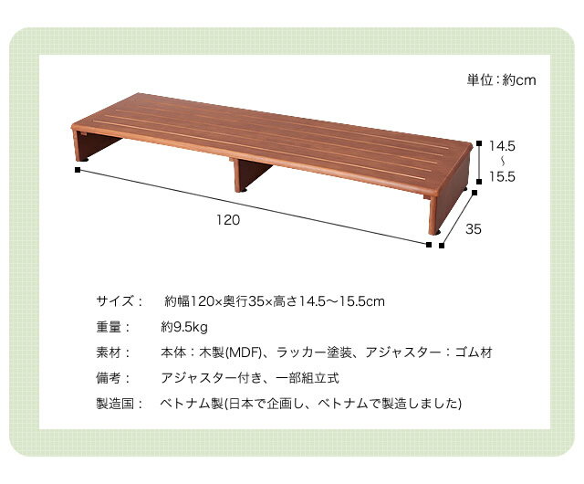 ●色/ブラウン ●サイズ/約幅120×奥行35×高さ14.5〜15.5cm ●重量/約8.5kg ●素材/本体:MDF(転写プリント)、アジャスター:ポリプロピレン ●備考/アジャスター付き、組立不要完成品 ●製造国/ベトナム製(日本で企画し、ベトナムで製造しました) ⇒60cm幅はこちら ⇒90cm幅はこちら ⇒120cm幅はこちら
