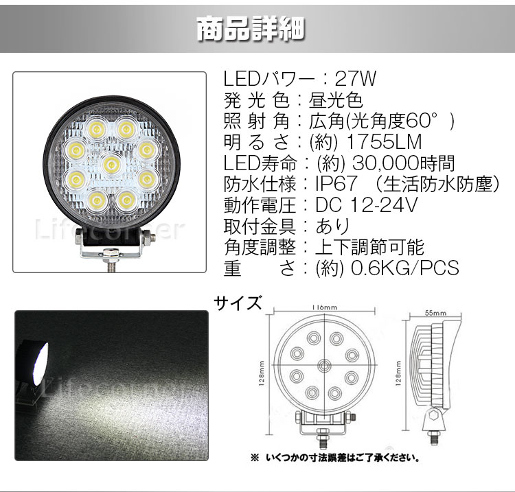 アイテム情報 商品仕様 LEDパワー: 3W型LED × 9PCS = 27W LEDチップ: LED チップ 商 品 名: LED 作業灯 27W 本 体 色: 黒色 照 射 角: 広角60度 明 る さ: (約) 1755LM 発 光 色: 昼光色(6000K-6500K) LED寿命: (約) 30,000時間 角度調整: 上下調節可能 入力電圧: 12V/24V兼用 防水仕様: IP67 (生活防水) 保存環境: -20℃ - +70℃ 重 さ: (約) 0.6KG/PCS 本体素材: アルミボディ、PC セット内容: 2台 商品ポイント ☞ 驚異的な照射能力と耐久性。 ☞ 明るくコンパクトな汎用LED作業灯(ワークランプ)です。 ☞ 取付金具:あり。 ☞ 取付ステーで上下のライト角度調整可能です ! ☞ 主に業務用として購入されることが多く、プロも納得の一品です。 ☞ バッテリーのプラスとマイナスの接続だけですぐに使用できます! ☞ 船舶、重機、農作業、トラクター、コンバイン、フォークリフト、路肩灯やフォグランプ等の夕暮れ時・夜間作業にとても役立ちます! ☞ 工場出荷前、発送前の2段階で点灯チェック! 主な用途 ☞ キャンプ、アウトドア、夜間、乗用車やトラックでの積み卸し、工事現場、防犯グッズに最適です。 ☞ トラックの荷台用の照明、フォークリフトのライト、除雪車のライト、海苔漁の常夜灯、シラス漁の常夜灯、漁船の作業用ライト、トラクターのライト、夜釣りの照明・集魚ライト、漁業用、農業機械、建設機械等の作業に、災害時の備えに、交通整理に、工事現場に様々な場面で活躍できます! ☞ 屋外や現場作業にも便利です。 注意事項 ☞ 安心の1年間保証付き! 取付の際のご注意、ご購入前に必ずこちらのページにご確認ください。 1.メーカー希望小売価格はメーカー商品タグに基づいて掲載しています。 2.メーカー希望小売価格はメーカー商品タグに基づいて掲載しています。 検索キーワード 車用品 カー用品 アウトドア トラック 車 アクセサリー イエロー 黄色 フィッシング ledライト エクストレイル led照明 オフロード トラック 用品 屋外 照明 防雨 led スポットライト ワーク ライト 工場 船舶 ledスポットライト 積載車 作業灯 led 投光器 12v 24v 車 取り付け おすすめ 大型 ジムニー パーツ バックランプ 明るさ ジムニー jb23 重機 フォグランプ 汎用 狹角 夜間作業 色温度 除雪 防水 ライト 電飾パーツ トラックパーツ led投光器 外装用品 ワークライト 軽トラ サーチライト 夜釣り 外灯 作業灯 整備 防雨型 コンパクト キャンプ サンバートラック サンバートラック イカ釣り 集魚灯 看板灯 トラック テールランプ バックランプ マーカーランプ 荷台 デッキライト 基準 バイク トラクター 路肩灯 小型ボート 釣りボート コンバイン バーライト カスタム 24v led路肩灯 バス 路肩 灯 キャリア タイヤ灯 ハイエース マグネット台 車検 エクストレイル X-TRAIL ランドクルーザー LAND CRUISER フォレスター FORESTER ジムニー JIMNY アウトランダー OUTLANDER FJクルーザー