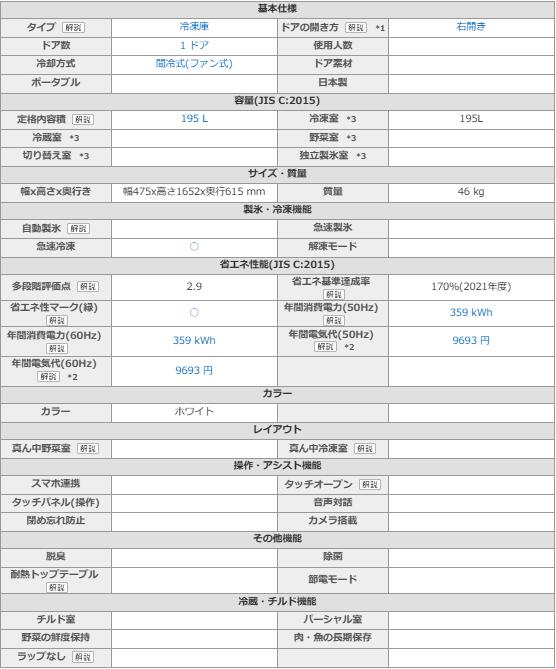 <頼もしい大容量> 保管しておきたいあれこれが、たっぷり入る195L。 ついつい買いすぎて、入れる場所がない!という悩みからも解放。 <設置しやすいサイズ感> 限られた設置スペースにも置きやすいよう、 冷蔵庫と並べても邪魔にならないサイズにこだわりました。 <インバーター搭載> インバーター搭載でコンプレッサーを効率よく運転し、 消費電力を抑えることができます。 省エネ基準達成率170%。