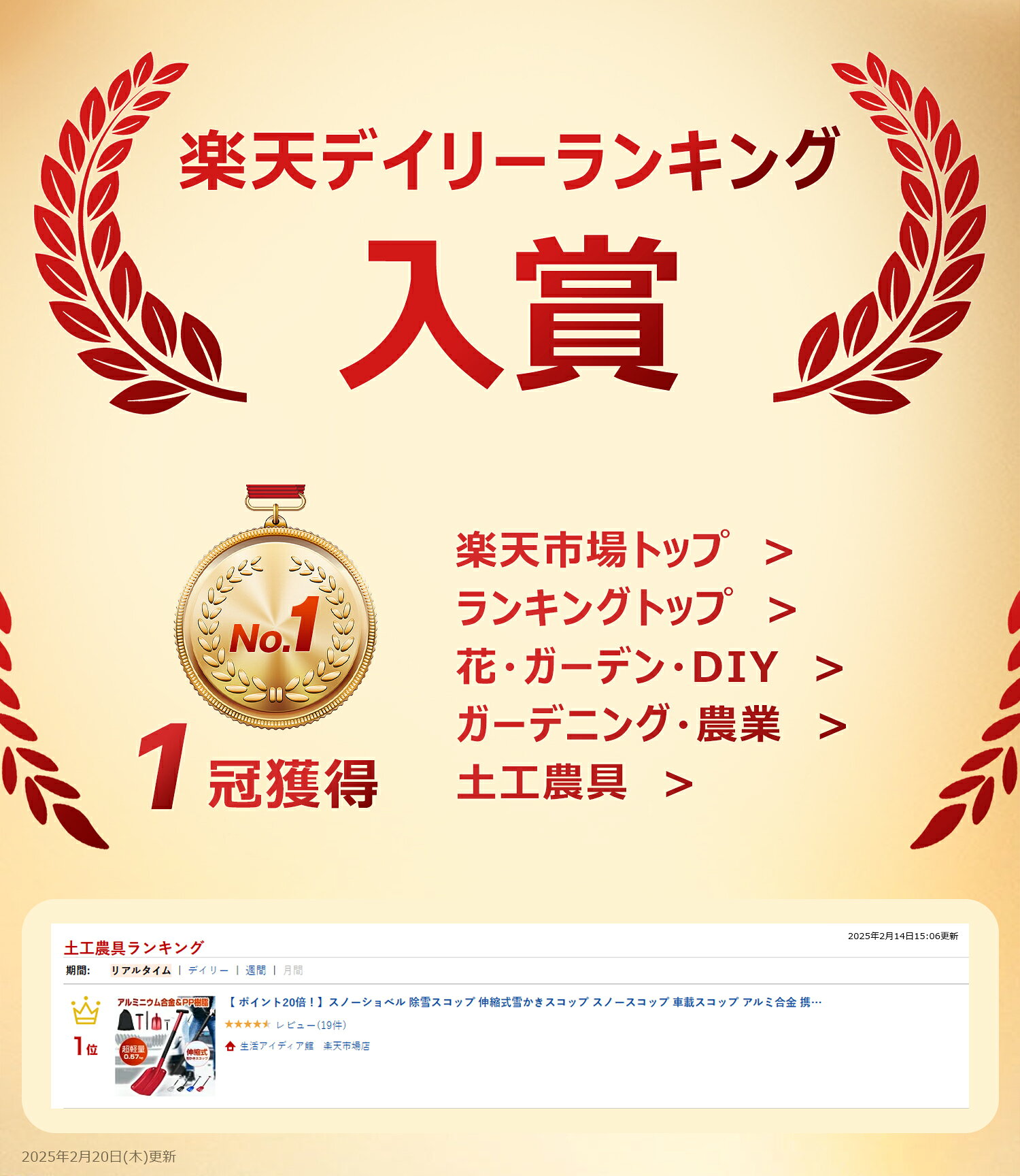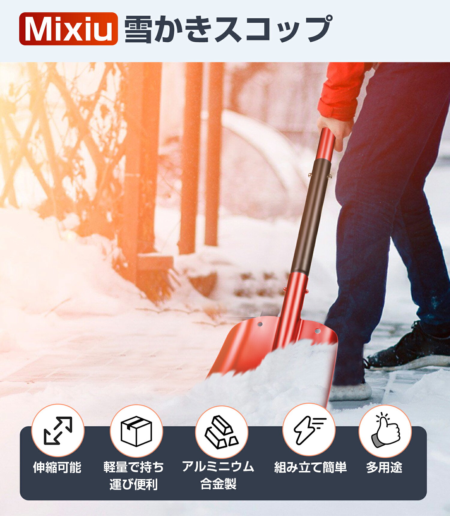 【アルミ合金製雪かきスコップ】人間工学に基づいたT字型ハンドルは、滑りにくいポリプロピレン樹脂を採用し、しっかりと握ることができ、快適な使用感が得られます。また、本体は防錆性と耐変形性を備えた高品質アルミニウム合金で作られており、ヘッドの面積も通常の雪かきスコップより大きく、より一層の効率化・効果的な除排雪作業を実施します。 【三段階長さ調節可能】スノーショベルはヘッド、延長パイプ、ハンドルの3つのシンプルなパーツで構成され、54/65/82cmの調整可能な長さが用意されております。長さが調整可能な伸縮式により、スノーショベルは幅広い用途のニーズに応えることができます。 【収納袋&アイススクレーパー付き】収納袋とアイススクレーパーを付属し、持ち運びやすく、幅広い除雪シーンへの対応を最適化。寒い冬に欠かせない除雪グッズです。 【多用途伸縮式雪かきスコップ】2023年最新版伸縮式雪かきスコップは雪かきに限らず、キャンプ、アウトドア、またガーデニング作業、移植作業、室内菜園などにも適しています。 【安心なカスタマーサービス】車載スコップをご使用中に何か不明点や質問がございましたら、お気軽にお問い合わせくださいませ。誠心誠意にご対応させていただきます。