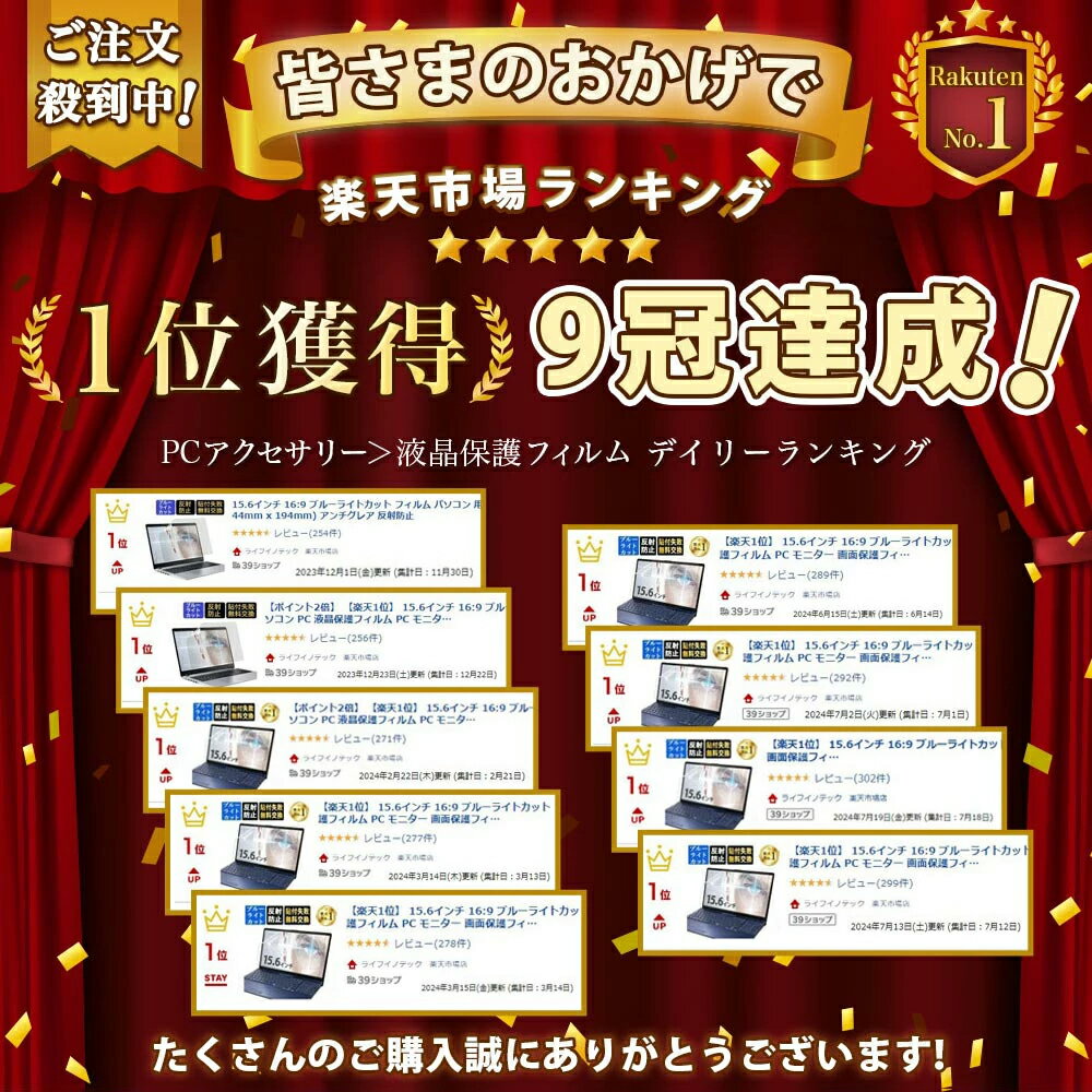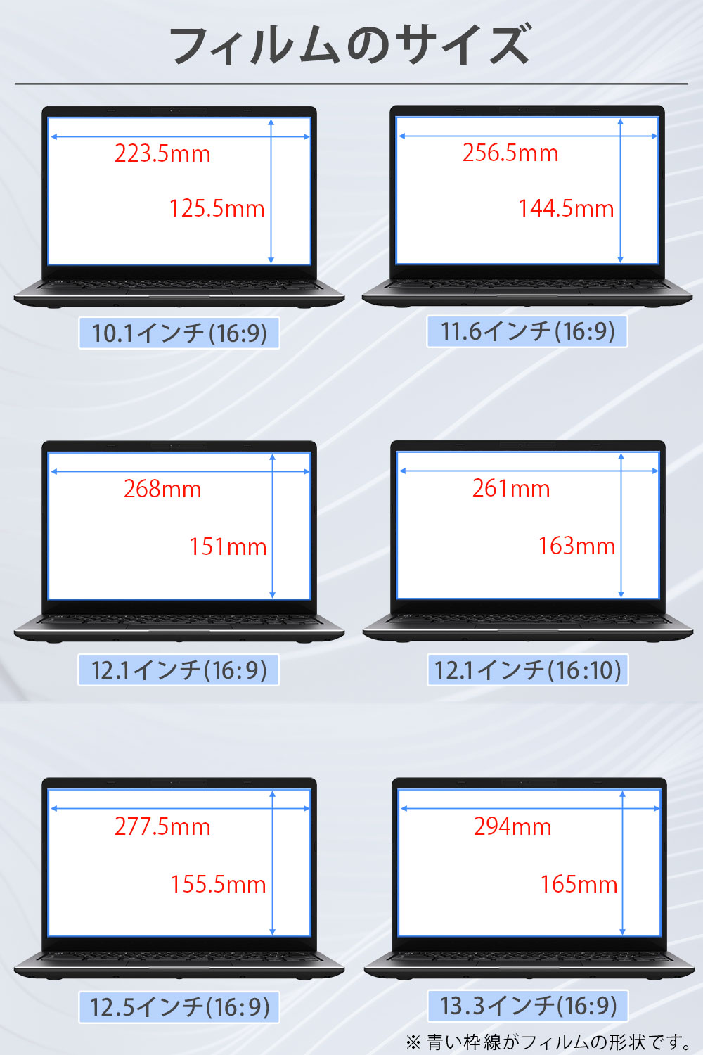 【楽天1位】 15.6インチ 13.3インチ 16インチ ブルーライトカット フィルム ノートパソコン [ 10.1 11.6 12.1 12.5 13.3 14 15.6 16 ] インチ・アスペクト比 [ 16:9 16:10 ] に対応 PC 液晶保護フィルム PC モニター 画面保護フィルム 反射防止 アンチグレア 透明 ●対応機種: 画面サイズ(画面比) 表示領域のサイズ 10.1インチ 16:9 223.5mm x 125.5mm 11.6インチ 16:9 256.5mm x 144.5mm 12.1インチ 16:9 268mm x 151mm 12.1インチ 16:10 261mm x 163mm 12.5インチ 16:9 277.5mm x 155.5mm 13.3インチ 16:9 294mm x 165mm 13.3インチ 16:10 285mm x 178mm 14インチ 16:9 309mm x 174mm 14インチ 16:10 301mm x 188mm 15.6インチ 16:9 344mm x 194mm 16インチ 16:10 344.5mm x 215mm ●特徴 ◎ブルーライトカット ブルーライトをあび過ぎると、眼精疲労を誘発し、体内リズムの乱れを引き起こす場合があると言われております。 本製品ではPCの画面から出るブルーライトを約49%低減できます。 また、紫外線のカット率は99%です。 目の負担を軽減するため、長時間のパソコン作業に最適です。 ◎反射防止 強い光による反射を抑え、画面が見えやすくなる超反射防止加工を施した ブルーライトカットタイプの液晶保護フィルムです。 反射防止(アンチグレア)加工により、光の映り込みを軽減し、画面を見やすくします。 ◎貼りやすい 自己吸着タイプなので画面にぴったり貼り付き、簡単かつきれいに貼ることができます。 フィルムを貼った後、特殊シリコン層吸着部が時間経過とともに気泡が分散し、目立たなく消えたようになります。 ※気泡サイズにより消えない場合があります。 ◎指紋防止 指紋や汚れが付きにくく、付いても簡単に拭き取ることができます。 ホコリが付着しにくい帯電防止仕様です。 タッチスクリーンにも対応しています。 ◎画面保護 硬度2Hのフィルムで液晶ディスプレイをしっかり保護します。 また適当な柔軟性があり貼り付けやすいです。 ◎抗菌性 フィルム表面が抗菌処理されており、細菌の繁殖を防ぎます。 ◎高い透明度 透明度が96%と非常に高いので、鮮やかな画面を楽しむことができます。 ◆貼り付け失敗無料交換サービス 貼り付けに失敗した商品をお送りいただければ、1度だけ新品交換させていただきます。 (返送送料のみ、お客様ご負担でお願いいたします。) ※貼り付け失敗無料交換のサービスは、商品ページに当案内がある商品のみ対象となります。 ◆注意事項 色あいなど画像と若干の違いがある場合があります。あらかじめご了承下さい。 ◆品質保証 商品到着時、ご注文と異なる商品が届いた場合や、初期不良などがある場合、1か月以内にメールにてご連絡ください。 商品のお取り換え、もしくはご返金をさせていただきます。
