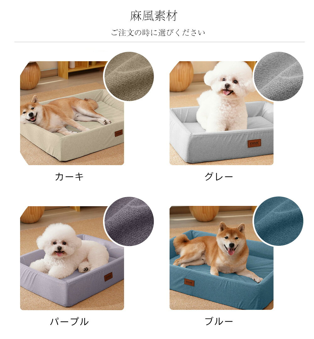 商品詳細 商品名 犬 ベッド 春夏秋冬 小型犬 中型犬 クッション 高反発 サイズ/重さ Sサイズ:51×39×10.5cm 重さ:約1.06kg Mサイズ:67×51×12.5cm 重さ:約1.6kg Lサイズ:71×67×14.5cm 重さ:約2.3kg 素材 ラビットファー調ファー素材タイプ: カバー生地:ラビットファー調のフェイクファー生地(ポリエステル100%)を使用。 マット詰め物:ウレタン100% 麻風素材タイプ: カバー生地:>麻風(ポリエステル100%)を使用。 マット詰め物:ウレタン100% 商品説明 【2種類の素材からお選びいただけます】 ラビットファー調のフェイクファー素材: 非常に保温性が高く、寒い季節にも最適です。一般的なフリース素材と比べて、より柔らかく優しい肌触りを実現しています。愛犬の快適さを追求した高品質な素材です。 麻風素材: 優れた通気性と速乾性を備えており、蒸れにくく快適な使用感を提供します。春夏秋冬、一年中を通じて使用できるため、季節を問わず活躍します。 【麻風素材のタイプと防水性】 麻風素材はTPU材質と複合されており、高い防水性能を実現しています。小型犬や高齢犬にも適しており、軽量で負担が少ない設計です。 【高反発スポンジクッション】 高反発性のスポンジクッションを採用しており、適度な支持性と弾力を兼ね備えています。愛犬の体をしっかりとサポートし、長時間の使用でも疲れにくい設計です。さらに、竹炭を配合しているため、消臭効果も期待できます。清潔で快適な環境を維持します。 【取り外し可能なカバー】 カバーは簡単に取り外し可能で、洗濯が非常に便利です。汚れた場合でも、清潔さを保つことができ、衛生面でも安心です。 【回型デザインと安心感のある枕部分】 回型デザインを採用しており、枕部分がしっかりとサポートします。これにより、愛犬がリラックスして眠れる環境を提供し、安心感を与えます。 ご注意 ※梱包方法は、多少圧縮された状態となる事から開封着後形を整えてから使ってください。 *色がある場合、モニターの発色の具合によって実際のものと色が異なる場合があります。 ※当店は中国に所在する事業者であるためお客様の注文 情報は当店が所在する中国へ提供いたします。 注文情報の提供について同意いただいた上でご注文ください。 中国の個人情報保護法制等について確認する場合は、 こちらのページ「https://corp.rakuten.co.jp/privacy/data-transfers.html」をご参照ください。 生産国 中国製