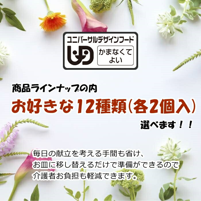 この商品のお気に入りに登録はこちら ※注意事項※ 注文確認後、メーカーへ在庫照会させて頂きます。 在庫欠品商品がございましたら、欠品商品のみ後日の発送となります。 その場合、当店より欠品商品の商品名と納期のお知らせメールを送信させて頂きます。介護食 12種類×各2個 24個詰合せ プラス1個おまけ付き! ・商品ラインナップからお好きな12種類(各2個入)を選べます! ・2個おまけ付き! ・お好みの食材を選んで自分だけのセットが作れます。 ・常温保存可能で、買いだめにも。 ・レンジや湯煎で温めるだけなので介助者の負担も軽減できます。 ・24個入りでレシピを考える手間も省けます。 ---------------------------------------------------------------------------------------------------- 介護を必要とされる方に喜んでもらえる方法はないか、 介助者の方の負担を少しでも軽減できる方法はないか、 「やさか介護センター」は福祉用具販売店として、 少しでも皆さまのお手伝いができればと思いこちらの商品を販売させて頂きました。 介護を必要とされる方には、 少しでも多く食事を口にはこんで頂き、食べる事の喜びを感じて頂けるよう また、介助者の方にとっては、 お食事の用意を少しでも短縮でき、 毎日の献立を考える負担を軽減し、少しでも休息のお時間を提供できれば・・ と思い、お好みの商品を数多く選べるように致しました。 介護・福祉に携わる店舗として、 少しでも皆さまのお役にたつことができましたら幸いでございます。 ----------------------------------------------------------------------------------------------------