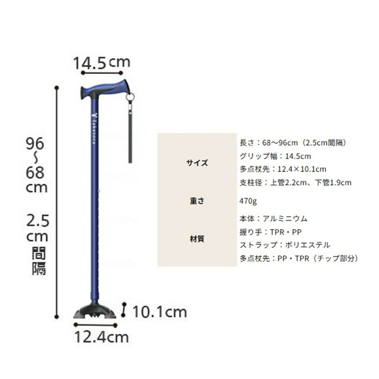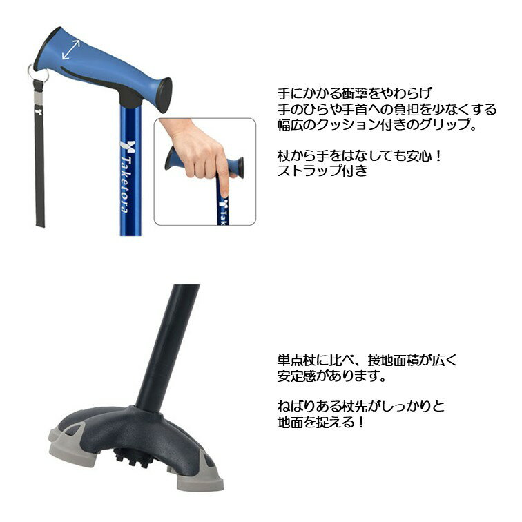 商品説明・ねばりある杖先がしっかり地面を捉える多点杖。手への負担が少ないワイドグリップ。 ・多点杖に比べて接地面積が広いので安定感がある多点杖先。 ・左右のどちらでも握りやすいグリップ形状。規格●サイズ/ 長さ68~96cm(12段階) グリップ長さ:14.5cm ベース部:幅10.1×奥行12.4cm ●パイプ径 上部:2.2cm、下部:1.9cm ●重さ 470g ●多点杖先内径 19mm材質○握り:TPR、PP ○支柱:アルミ関連商品はこちら【 バンブーステッキ ワイド 】 伸縮 お...送料無料!【 アルミ製4点支柱杖 】マキ...【四点前後可動固定式 2ウェイステッキ ...【送料無料】四点可動式オン・オフさん ...