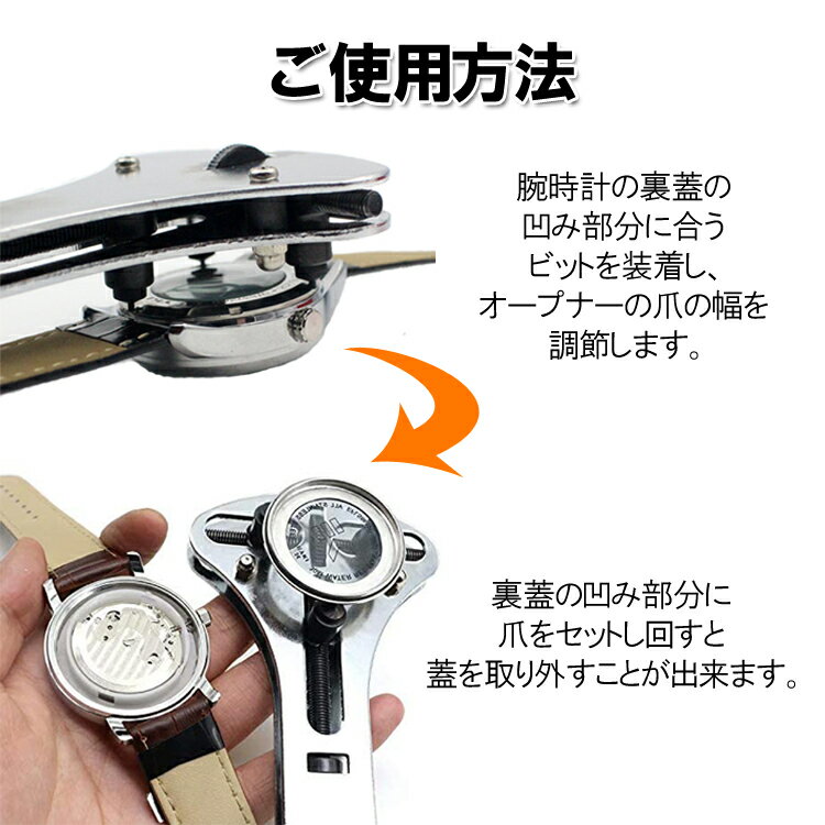 ◇送料について ゆうメール(または定形外郵便) 限定送料無料!(代引きはゆうメール不可) 代引きをご希望の場合は別途送料+変更事務手数料で900円をご請求致します。 オプション加算分はご注文承諾時に加算となります。 ※発送方法は選択出来ません。 ※メール便(または定形外郵便)配送商品について ※メール便、定形外、ゆうパケットなどポスト投函の発送方法について運送会社および弊社の紛失・破損保証は御座いません ※取付及び使用方法のサポートはございません ※マニュアル、取扱説明書等は付属いたしません ※◇メール便配送商品について ※当商品はメール便送料無料でご提供させていただいております。メール便につきましてはサイズ制限があるためパッケージなしの簡易梱包での発送をしております。予めご承知頂けますと幸いです。 ゆうメール(または定形外郵便)配送商品は基本的に 追跡なし、ポスト投函での配送となります。 また、万が一サイズ等の理由でポスト投函が出来なかった場合、不在届が投函されます。 その際に長期間ご連絡がない場合、当店への返送が行われます。 再配達には追加料金がかかることになりますので、予めご了承の程お願いします。 当店より発送後1週間が経過しても商品が到着しない等の場合、まずはポストの方をご確認ください。 不在票がございましたらお近くの配送会社営業所へご連絡下さい ■並行輸入商品のご注文に関しての注意事項■ ※輸入品の為、外装や本体に輸送に伴う傷やスレ、潰れなどまれにある場合がございます ※パッケージは付しない場合がございます。 ※取付及び使用方法のサポートはございません※生産ロットによりロゴデザインの変更、ロゴが無い場合がございます ※取付や使用によるトラブル等に関し弊社の保障は一切ございません ※仕様やデザイン、パッケージ等は予告なく変更される場合がございます ※製造時期により外観や仕様に若干の変更がある場合がございます。予めご了承ください ※海外輸入品のため、多少サイズおよび現物と出品画像には誤差がある場合がございます■商品説明 防水腕時計の電池交換に便利な三点支持オープナーです。 最大開閉幅55mmなので、大型腕時計にも対応しています。 付け替え式ビット18個付属で、様々な種類の腕時計にご使用いただけます。 お店に持ち込まなくてもご自宅で簡単に電池交換が可能です。 【ご使用方法】 (1)腕時計裏蓋の凹みに合う形状の付け替えビットを選びます。 (2)腕時計のサイズに合わせてオープナーの爪の位置を調節します。 (3)凹み部分に爪をセットして回すと蓋を取り外すことができます。 ■商品仕様 最大開閉幅:55mm 本体サイズ:約16.3×7.1cm 総重量:約190g セット内容:三点支持オープナー、付け替え式ビット18個(円形小6個/円形中3個/三角3個/四角3個/半円3個) ◇注意事項 ※三点支持オープナーと付け替え式ビットのみとなり、その他のものは付属しません。 ※すべての腕時計には適用保証は御座いません ※時計修理は自己責任で申し上げます ※ご使用済みの場合は返品返金対応しかねます。 ※当商品を使用した際に起こった事故ならびに損害等については一切の補償をいたしかねます。 ※日本語説明書は付属いたしません。また、取付や使用方法についてのサポートは行っておりません。 ※輸入品の為、輸送に伴う小傷やスレ等が外装や本体にある場合がございます。 ※製造時期により外観や仕様に若干の変更がある場合がございます。予めご了承ください。 ※ご使用の際は事故のないように、取り扱いには十分お気を付けください。 ※ご使用済みの場合は返品返金対応しかねます。 ※色違い、相性が悪いなどの理由で返品交換は受け付けできません。 ※手計測のため、寸法や重量など実際とは異なる場合がございます。 ※ご使用のディスプレイにより色合いが違って見える場合がございます。 ■並行輸入商品のご注文に関しての注意事項■ ※輸入品の為、外装や本体に輸送に伴う傷やスレ、潰れなどまれにある場合がございます。 ※パッケージは付属しません。 ※取付及び使用方法のサポートはございません ※生産ロットによりデザインやサイズ等の変更がある場合がございます ※取付や使用によるトラブル等に関し弊社の保障は一切ございません ※輸入商品のため小傷や汚れ等ある場合がございます ※仕様やデザイン等予告なく変更される場合がございます ※製造時期により外観や仕様に若干の変更がある場合がございます。予めご了承ください。 ※海外輸入品のため、多少サイズおよび現物と出品画像には誤差がある場合がございます。 ◇メール便配送商品について ※当商品はメール便送料無料でご提供させていただいております。 メール便につきましてはサイズ制限があるためパッケージなしの簡易梱包での発送をしております。予めご了承くださいす。 ゆうメール(または定形外郵便)配送商品は基本的に 追跡なし、ポスト投函での配送となります。
