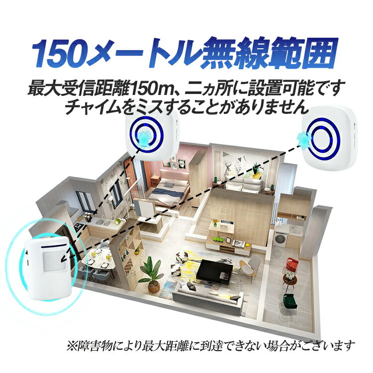 ◆送料について ゆうメール(または定形外郵便) 限定送料無料!(代引きはゆうメール不可) ※発送方法は選択出来ません。 ※メール便(または定形外郵便)配送商品について ※メール便、定形外、ゆうパケットなどポスト投函の発送方法について運送会社および弊社の紛失・破損保証は御座いません。 ◆メール便配送商品について ※当商品はメール便送料無料でご提供させていただいております。メール便につきましてはサイズ制限があるためパッケージなしの簡易梱包での発送をしております。予めご承知頂けますと幸いです。 ゆうメール(または定形外郵便)配送商品は基本的に 追跡なし、ポスト投函での配送となります。 また、万が一サイズ等の理由でポスト投函が出来なかった場合、不在届が投函されます。 その際に長期間ご連絡がない場合、当店への返送が行われます。 再配達には追加料金がかかることになりますので、予めご了承の程お願いします。 当店より発送後1週間が経過しても商品が到着しない等の場合、まずはポストの方をご確認ください。 不在票がございましたらお近くの配送会社営業所へご連絡下さい。 ■並行輸入商品のご注文に関しての注意事項■ ※輸入品の為、外装や本体に輸送に伴う傷やスレ、破れや潰れなどある場合がございます。 ※パッケージ外装の損傷等(商品本体に影響がない場合)による理由での返品交換は受け付けておりませんことご了承下さい。 ※パッケージは付属しない場合がございます。 ※取付及び使用方法のサポートはございません※生産ロットによりロゴデザインの変更、ロゴが無い場合がございます。 ※取付や使用によるトラブル等に関し弊社の保障は一切ございません。 ※仕様やデザイン、パッケージ等は予告なく変更される場合がございます。 ※製造時期により外観や仕様に若干の変更がある場合がございます。予めご了承ください。 ※海外輸入品のため、多少サイズおよび現物と出品画像には誤差がある場合がございます。■商品特徴 ●発信機1個対受信機2個:受信機は2個あるので、別々のところに設置可能。 1階と2階など設置場所を分けて使うことができます。 ●赤外線センサー:人を自動的感知、感知距離は約3m-7m、感知角度は上下15°、左右100° ●無線通信距離:障害物が無い場合最大150m(メーカー発表値、実際の建物環境により変わります、弊社の動作確認では30m〜60m目安) 来客のお知らせ用だけでなく、防犯用アラームとしても役立ちます。 ※障害物により最大距離に到達できない場合がございます ●大音量/静音モード設定可:音量調節可能、音量調節3段階(25-113db)、36種類の音楽が選択可能、光と声/光だけ(静音モード)2モード ●取付簡単&工事不要 【ペアリング方法】 1.送信機に単四乾電池3個を入れてください 2.受信機をコンセントに差し込んで指示LEDが常時点灯状態になってから、音量調節ボタンを長押しをしてください。 3.受信機のライトが消灯するとペアリング済みになります。 (ペアリングされていない場合は、送信機の指示ライトが赤くなります。受信機の反応はありません。) 【製品仕様】 受信機の動作電圧:AC 100V〜240V 送信機の動作電圧:DC 4.5V(単四乾電池×3個)(※乾電池は別売りです) ※送信機 DC5V USB給電も対応でございます(※USB給電ケーブルは別売りです) 動作距離:最大150m(直線見通し・遮蔽物の無い環境) ※電波到達距離は理論値です。状況や環境によって距離が異なります。 送信機の検知距離:約3m〜7m 感知角度:上下15°、左右100° 受信機のサイズ:約76mm×80mm×33mm 送信機のサイズ:約80mm×59mm×45mm 重量:約0.31kg セット内容:受信機×2、発信機×1、ブラケットセット×1、英語マニュアル×1 ▼注意事項 ※本商品は技適マークが貼付されていない無線機器であり、国内で使用する場合は電波法違反になる恐れがございます。 ご使用の際には十分にご注意下さいますようお願い致します。 ※出品物はワイヤレス呼び出しチャイムのみとなり、付属品記載以外のものは付属しません。 ※防水式ではありません。軒下等への設置をおすすめです。 ※電波到達距離は、壁や遮蔽物のない場所での最大距離になります。壁や遮蔽物、周囲の電波状況により電波が届かなくなる場合があります。 ※日本語説明書は付属いたしません。また、使用方法についてのサポートは行っておりません。 ※取り付け後、またご使用後の返品返金対応はできません。 ※色違いや相性等の理由での返品交換は受け付けできません。 ※小さなお子様の手の届かない場所でお取り扱い・保管してください。 ※ご使用の際は事故のないように、取り扱いには十分お気を付けください。 ※当商品を使用した際に起こった事故や損害、トラブル等に関し弊社の保障は一切ございません。 ※輸入品のため、外装や本体等に輸送に伴う傷やスレ、潰れなどある場合がございます。 ※パッケージは付属しない場合がございます。 ※生産ロットにより仕様やデザイン、サイズ等予告なく変更される場合が