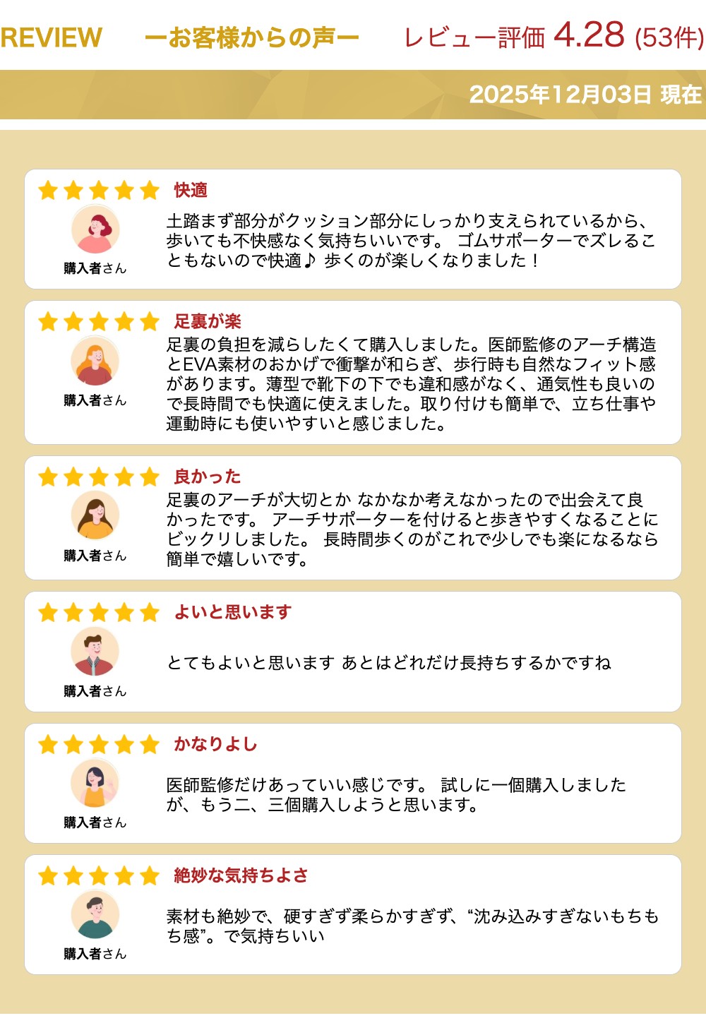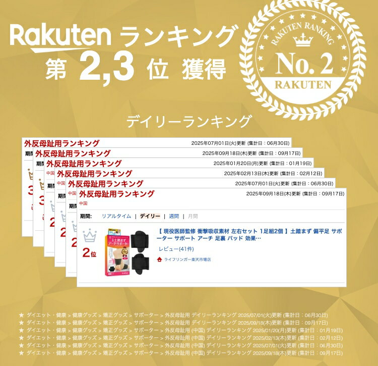 ● item infomation 商品名 土踏まず 偏平足 サポーター サポート アーチ 足裏 パッド 効果 スポーツ ランニング 痛み つちふまずサポーター 足底筋膜炎 衝撃吸収 中敷き 外反母趾 足裏アーチサポーター ブランド名 Liferinger ( ライフリンガー ) カラー ブラック 素材 ナイロン サイズ 14.7 x 14 x 3.3 cm; 50 g JANコード ●1足入:4595640690293 ●2足入:4595640690309 特長 【 現役医師 ( 日本ペインクリニック学会専門医 )が監修 】 「 痛み症状の専門家 」であるペインクリニック学会専門医・吉川博昭氏による監修。長時間の立ち仕事や、歩行、ランニング時、その他スポーツ等の使用で、足の負担を感じている方たちを一人でも多く救いたい。そんな想いで生まれた足底専用アーチサポーターです。あらゆる足型の方にもフィットするように設計されています。 【 専門家の声から生まれたアーチ構造と衝撃吸収素材EVA 】 一般的なサポート設計には見られないアーチ構造と、衝撃吸収素材EVAを使用する事であらゆる足型の方にもフィットさせる事に成功。フィットさせながらも首部分を安定させることが可能になっています。 足底・足首をサポートし、歩きながらでも装着している事を忘れるほどの自然な使用感を体験いただく事が出来ます。 【 こだわったのは軽さと通気性 】 商品が頑丈であっても、重くてつけ心地の悪いものでは、長時間の装着が困難です。そこで当商品がこだわったのが、「軽さ」と「通気性」。従来品よりも、1gでも軽量化を行う事、そして通気性を両立するために、高品質のナイロン素材を使用して軽さと通気性を向上させています。 薄型のため、靴下装着時でも自然にフィットし、靴を履いて違和感なく歩くことが出来ます。 【 取り付け簡単 】 素足に直接装着するとも違和感なく行えます。ヨガやジョギング時、その他のスポーツ時でも装着することが可能です。靴下やストッキングを履いた状態でも使用可能です。 【 日本で検品サポート 】 当商品は日本ブランドです。開発、検品、発売、サポートまで一貫して行っております。製造は実績ある国外工場と契約し行っております。 【 365日保証付き 】 お買い上げから365日の品質保証をお付けしております。万が一、注文後にサイズ違い、歩行中の破れなどありましたら無償でお取替えさせていただきます。 さまざまな御用途でご利用頂けます 土踏まず 偏平足 サポーター サポート アーチ 足裏 パッド 効果 スポーツ ランニング 痛み つちふまずサポーター 足底筋膜炎 衝撃吸収 中敷き 外反母趾 足裏アーチサポーター 足の裏 痛い かかと 扁平足 おすすめ 楽天 靴下 ランキング どこに売ってる インソール 靴 口コミ 吸収 衝撃 歩行 負担 足裏健康サポーター アーチサポーター フリーサイズ 土踏まずサポーター 扁平足インソール 足裏サポーター 足首 左右セット 男女左右兼用 テーピング O脚 かかと保護カバー アキレス腱炎 ケガ シリコン テーピングサポーター メンズ モニター発色 レディース 傷 剣道 姿勢 形状 扁平足サポーター 故障 矯正 色合い 1足組2個 送料無料 製造国 企画:日本 / 製造:中国 商品情報商品の重量?50 g梱包サイズ14.7 x 14 x 3.3 cm; 50 g色?ブラック材質ナイロン厚さ1センチメートル特徴軽量, 耐久性 メーカー希望小売価格はメーカーサイトに基づいて掲載しています関連商品【 現役医師監修 衝撃吸収素材ネオプレン採用 S・Lサイズ 】 かかと...\ 楽天1位 /【 予約販売 】【 現役医師監修 高さ調節対応 折りた...【 現役医師監修 衝撃吸収素材 左右セット 1足組2個 】土踏まず 偏...1,980円2,980円1,439円\ 楽天1位 /【 美容専門家監修 】トラベルポーチ メイクポーチ ...\ 楽天1位 /【 現役医師?BEST BODY JAPAN公認講師監...\ 楽天1位 /【 現役防災士監修 回転刃を20回以上往復しないと切れ...1,599円1,590円1,490円【 現役医師監修 衝撃吸収素材ネオプレン採用 S・Lサイズ 】 かかと...【 現役美容皮膚科医監修 】 ツボ押し棒 足つぼ 肩こり フェイスマ...【 現役医師(整形外科医)監修 最新ワンタッチ装着で外れにくい仕様 】...1,782円1,980円2,980円現役医師監修 衝撃吸収素材 左右セット 1足組2個 土踏まず 偏平足 サポーター サポート アーチ 足裏 パッド 効果 スポーツ ランニング 痛み 日本ブランド つちふまずサポーター 足底筋膜炎 衝撃吸収 中敷き 外反母趾 足裏アーチサポーター ● item infomation 商品名 土踏まず 偏平足 サポーター サポート アーチ 足裏 パッド 効果 スポーツ ランニング 痛み つちふまずサポーター 足底筋膜炎 衝撃吸収 中敷き 外反母趾 足裏アーチサポーター ブランド名 Liferinger ( ライフリンガー ) カラー ブラック 素材 ナイロン サイズ 14.7 x 14 x 3.3 cm; 50 g JANコード ●1足入:4595640690293 ●2足入:4595640690309 特長 【 現役医師 ( 日本ペインクリニック学会専門医 )が監修 】 「 痛み症状の専門家 」であるペインクリニック学会専門医・吉川博昭氏による監修。長時間の立ち仕事や、歩行、ランニング時、その他スポーツ等の使用で、足の負担を感じている方たちを一人で