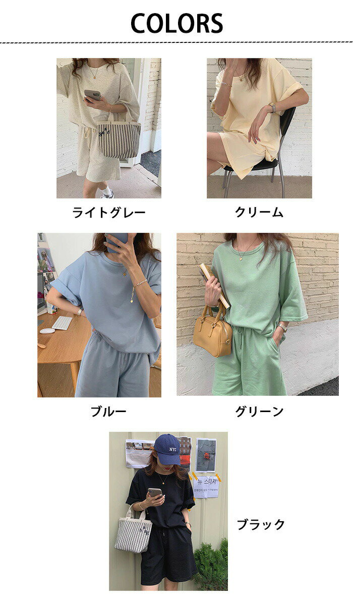 メーカー希望小売価格はメーカーカタログに基づいて掲載しています【商品詳細】※スリムフィットでスタイリッシュな女性のコーデの幅を広げるTシャツとショートパンツの2点セットです!ゆったりとしたジャージで動きやすく、締め付け感もなく着心地いい。※ボトムはショートパンツなので脚長効果がある。ウエストはゴム仕様で、動きやすくて脱着もしやすい。デザイン性実用性を兼ね備え、日常快適ライフファッションにおススメのセットアップです。※カジュアルコーデにはもちろん、スポーツやアウトドア、ルームウェア(部屋着)など様々シーンで活躍してくれる!ゆったりまったりな休日の部屋着として活躍してくれそうです。シンプルなデザインながらも、徹底的に拘りぬいたシルエットのデザインが、着るだけで存在感のあるスタイリングに仕上げてくれます。※トップスとボトムスを別々で着用し、お手持ちのアイテムと組み合わせればコーディネートの幅も広がります。夏の時期絶対オススメなレディーススポーツウェア、フィットネスウェア、普段カジュアルウエア、着るだけで存在感ある仕上がりしてくれる。※緩いサイズので、あなたはベッドで自由に動くことができます。お部屋でのリラックスタイムのルームウェアやパジャマとしてぴったり。春、夏、秋はとても適当な選択です。母親や妻、お友達、恋人へのプレゼントとしてもオススメ。【サイズ】M/L/XL/XXLM:トップス丈63cm パンツ丈45cm 袖丈18cm バスト102cmL:トップス丈65cm パンツ丈46cm 袖丈19cm バスト106cmXL:トップス丈67cm パンツ丈47cm 袖丈20cm バスト110cmXXL:トップス丈69cm パンツ丈48cm 袖丈21cm バスト114cm【カラー】ライトグレー/クリーム/ブルー/グリーン/ブラック【素材】コットン+ポリエステル生産国:中国ご注意事項◆沖縄、離島へのお届けにつきましては、追加送料1,800円を頂戴いたします。※写真撮影時使用の小物、アクセサリーは商品に含まれておりませんので、あらかじめご了承くださいませ。※計測方法や個体差により、サイズに若干の誤差が生じる可能性がございます。※商品の色合いは、お使いのモニターやカメラの設定により実物と異なって見える場合がございます。※製造時期によりまして、デザインや仕様が変更となる可能性がございます。※在庫状況はリアルタイムで変動しておりますため、ご注文後に品切れとなる場合がございます。何卒ご容赦ください。※万が一商品に不具合がございましたら、お手数ではございますが、到着後速やかに当店までご連絡いただけますと幸いです。