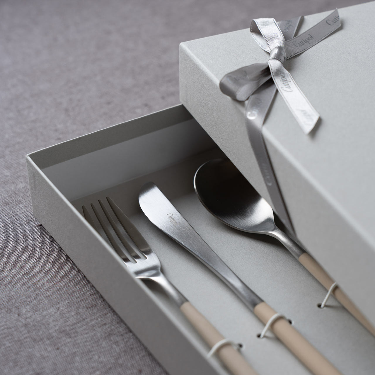 洗練されたフォルムで世界中で人気の高いポルトガルのカトラリーブランド「Cutipol」。1本1本ハンドメイドで仕上げられる作品とも言えるその美しいデザイン、人間工学に基づき設計された持ちやすさ、使いやすさをともなった機能的なカトラリーです。Cutipolカトラリー2019年発表のMIOシリーズ。エレガントでソフトな曲線が特徴で柔らかい印象のカトラリーです。クチポールの定番シリーズのGOAと同様、適度なヘッドの重み、木製のようですべりにくいさらっとしたアセタール樹脂(25%ガラス繊維強化)の持ち手が絶妙なバランスで設計されており、誰もが使いやすさを実感できます。ナチュラルテイストのアイボリーカラーは、ウッド調のテーブルやお皿とも相性がよく温かい雰囲気を出してくれます。クチポールロゴ入りホワイトグレーのボックスに入れ、純正リボンを掛けてお届けします。クチポール正規品の証となる日本語版のリーフレットも付属しており、クチポール社のメッセージとともに製造風景などが紹介されています。また、当店オリジナルショッパー(紙袋)が付属しておりますのでそのままプレゼントとしてお渡しいただけます。■商品名クチポール MIOディナー6本セット アイボリー/マットシルバー化粧箱入り リボン掛け 手提げ(紙袋)つき(ディナーナイフ/フォーク/スプーン 各2本) ■サイズ(約)長さ:スプーン 22cm、ナイフ 23cm、フォーク 22.5cm重さ:スプーン 36g、ナイフ 29g、フォーク 29g※ハンドメイドのため仕上げに個体差があります。化粧箱:幅25cm × 奥行27cm × 高さ4.5cm■素材18-10ステンレス、アセタール樹脂(25%ガラス繊維強化)食洗機の使用可 ※高温洗浄は不可。手洗いをおすすめします。■製造クチポール ※当店はCutipolの日本正規取扱店です生産国:ポルトガル商品の品質やお手入れ方法などクチポールに関するQ&Aはこちら■その他のカラー・サイズはこちら カトラリーレスト 単品 2本セット 3本セット 4本セット 6本セット 4本ギフト 各種ギフトていねいに仕立てたクチポール製の化粧箱に、クチポールロゴの入ったリボンを掛けて、上品さを演出しています。(実際は箱をセットして外箱にリボンを掛けます。)仕上がりの良さからクチポールで採用された純正の貼り箱は日本製。上品なホワイトグレーにゴールドの箔押しを表現したロゴが特別感を演出します。クチポールの正規品の証となるリーフレット日本語版が付属。クチポール社のメッセージとともに製造風景などが紹介されています。当店は、クチポール公式ページに正規店舗として掲載されておりますので、大切なかたへの贈り物に安心してお選びください。クチポール MIOのかたちMIOのフォークは側面がカーブしていることで料理を切り分けやすく、また、指したまま食材を口に含むときには優しい口あたりを実感できます。MIOはGOAに比べ横幅がディナーサイズで6mm、デザートサイズで5mm短く細長くなることで、すくって口に含む使い方に適しています。ナイフの先端は丸みを帯びたデザインに変更。切れ味は変わらず、よりエレガントでソフトな曲線美に生まれ変わりました。
