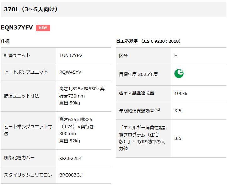 仕様 商品名 ダイキン エコキュート Nシリーズ EQN37YFV 370Lタイプ (3〜5人向け) 貯湯ユニットTUN37YFV ヒートポンプユニットRQW45YV 貯湯ユニット寸法高さ1,825×幅630×奥行き730mm 質量 59kg ヒートポンプユニット寸法高さ635×幅825(+74)×奥行き300mm 質量 52kg 脚部化粧カバーKKC022E4 スタイリッシュリモコンBRC083G1 省エネ基準 (JIS C 9220:2018) 区分 E 省エネ基準達成率 100% 年間給湯保温効率※1 3.5 「エネルギー消費性能計算プログラム(住宅版)」へのJIS効率の入力値 3.5 ※1 年間給湯保温効率(JIS)及び年間給湯効率(JIS)は、日本産業規格JIS C 9220に基づき、ヒートポンプ給湯機を運転した時の単位消費電力量あたりの給湯熱量及び保温熱量を表したものです。※3 年間給湯保温効率(JIS)及び年間給湯効率(JIS)は、日本産業規格JIS C 9220に基づき、ヒートポンプ給湯機を運転した時の単位消費電力量あたりの給湯熱量及び保温熱量を表したものです。