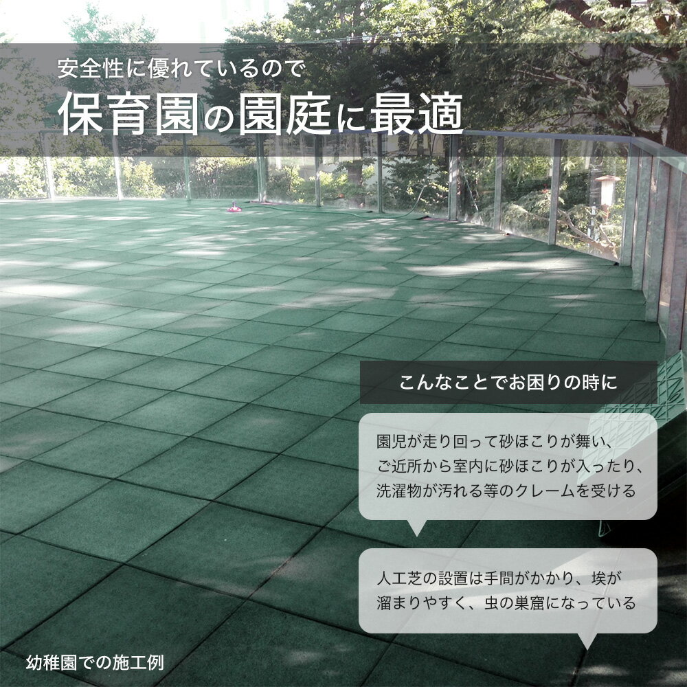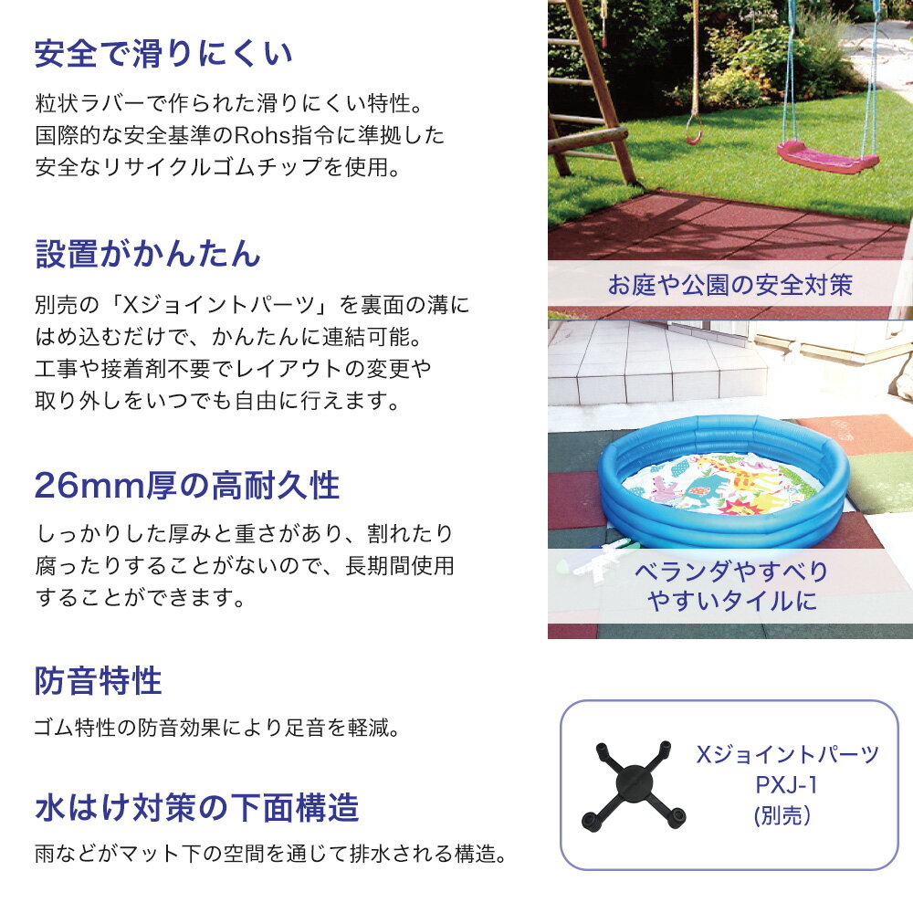 ゴムマット セーフティーマット ジョイントラバーマット 4枚セット 安全マット 50cm×50cm×2.6cm 屋外 庭 ゴムチップマット タイル DIY公園 広場 遊び場 保育園 幼稚園 園庭 ホームセンター 販売中 庭でバスケの練習用 バスケットボール練習用 プロテック ▼▼連結に必要なジョイントパーツはこちら▼▼ Xジョイント専用ジョイントパーツ Xジョイント専用くの字型ジョイントパーツ 公園や運動場などの公共施設、幼稚園・保育園の園庭、ご自宅の玄関、 お庭、ベランダ・バルコニーに簡単に連結して設置出来る上部で滑りにくゴムマット 【滑りにくい】 粒状ラバーで作られた滑りにくい特性 国際的な安全基準のRohs指令に準拠した 安全なリサイクルゴムチップを使用 【設置がかんたん】 別売りの「Xジョイントパーツ」を裏面の溝に 工事や接着剤不要でレイアウト変更や 取り外しをいつでも自由に行えます。 【設置がかんたん】 別売りの「Xジョイントパーツ」を裏面の溝に 工事や接着剤不要でレイアウト変更や 取り外しをいつでも自由に行えます。 【26mm厚の高耐久性】 しっかりした厚みと重さがあり、割れたり 腐ったりすることがないので、長時間使用することができます。 【防音特性】 ゴム特性の防音効果により足音を軽減。 【水はけ対策の下面構造】 雨などがマット下(裏面)の空間を通じで排水される構造。 ▼関連ワード▼ ゴムマット / ラバーマット / ジョイントマット / ジョイントゴムマット / 屋外 / 滑り止め / 滑り止めマット / 公園 / バスケットボール / 庭のバスケ練習用 / 幼稚園 / 保育園 / 安全 / 防音 / 転倒防止 / グリーン / 緑 / レッド / 赤 / ブラウン / 茶色 / ベージュ / グレー / イエロー / 黄色 /ゴムマット セーフティーマット ジョイントラバーマット 4枚セット 安全マット 50cm×50cm×2.6cm 屋外 庭 ゴムチップマット タイル DIY公園 広場 遊び場 保育園 幼稚園 園庭 ホームセンター 販売中 レッド グリーン ライムイエロー ベージュ プロテック Xジョイント専用ジョイントパーツ Xジョイント専用くの字型ジョイントパーツ 【ご注意事項】 ・連結するには併売中の「Xジョイントパーツ」が必要になります。 ・出荷時は剥離剤が塗られているため透水性が低い場合があります。 剥離剤は自然と薄くなりますが、洗剤で一度洗いますと透水性が高まります。 ・掲載画像の色味は、実際の商品と異なる場合がございます。 ・裏面等に製造時に付いた黒いチップが付着している場合がありますが、 使用上全く問題ございません。 ・従来品のエックスジョイントマット(PXR-525)とはサイズ、高さ、色味、重さが 異なります。PXR-525をお求めの方はお問い合わせよりご相談ください。 ■ 10セット以上まとめてご購入される場合は、在庫数や配送料の確認の都合上、 ご注文前に当店へご連絡頂きますようお願いいたします。