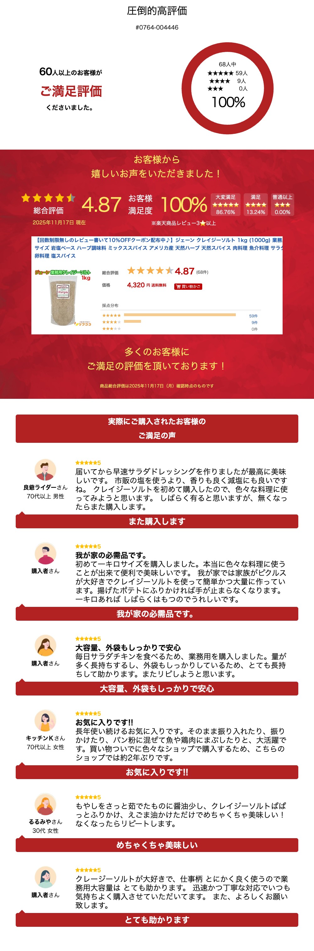 商品情報商品詳細●岩塩をベースにペッパーやオニオン、ガーリックなど数種のハーブを絶妙にブレンドし、何種類ものスパイスを揃える必要のないお手軽な商品になります。●アメリカ・ヨーロッパでは一流レストランはもちろん家庭料理にも欠かせない天然ハーブ&スパイス調味料として広く定着しています。●肉料理、魚介料理、サラダ、卵料理など幅広くご利用頂けます。内容量1kg原材料岩塩、ペッパー、オニオン、ガーリック、セロリ、タイム、オレガノ賞味期限別途商品ラベルに記載保存方法直射日光を避けて、常温で保存して下さい。原産国アメリカ合衆国注意事項※パッケージデザイン等は予告なく変更されることがあります。※当店では「のしやギフト梱包」のサービスは行っておりません。※「ご注文後」のお客様都合によるキャンセルや宛先の変更などは一切お受けしておりません。ご理解とご協力の程よろしくお願い申し上げます。関連キーワード(商品の説明ではありません)ジェーン クレイジーソルト 業務用 岩塩ベース ハーブ調味料 ミックススパイス BBQ バーベキュー関連商品【回数制限無しのレビュー書いて10%OFFクーポン配布中♪】ジェーン ...【回数制限無しのレビュー書いて10%OFFクーポン配布中♪】ジェーン ...【回数制限無しのレビュー書いて10%OFFクーポン配布中♪】ゲランドの...3,980円12,960円3,998円【回数制限無しのレビュー書いて10%OFFクーポン配布中♪】阿蘇健康農...【回数制限無しのレビュー書いて10%OFFクーポン配布中♪】天然深層海...【回数制限無しのレビュー書いて10%OFFクーポン配布中♪】ジェーン ...4,536円5,184円2,680円【回数制限無しのレビュー書いて10%OFFクーポン配布中♪】ジェーン ...【回数制限無しのレビュー書いて10%OFFクーポン配布中♪】天然深層海...【回数制限無しのレビュー書いて10%OFFクーポン配布中♪】ゲランドの...2,458円3,240円3,240円【回数制限無しのレビュー書いて10%OFFクーポン配布中♪】天然深層海...【回数制限無しのレビュー書いて10%OFFクーポン配布中♪】まとめ買い...【回数制限無しのレビュー書いて10%OFFクーポン配布中♪】天然深層海...6,480円4,860円1,728円関連ワード: ジェーン クレイジーソルト 1kg ミックススパイス 業務用サイズ 岩塩 ハーブ調味料 アメリカ産 天然ハーブ 天然スパイス 肉料理 魚介料理 サラダ 卵料理 ペッパー オニオン ガーリック セロリ タイム オレガノ 岩塩ベース 調味料 定期購入 クレイジーソルト 1000g 1キロ 常温保存 料理用 塩スパイス 無添加スパイス 風味豊か ギフトなし 自宅用 家庭料理 専用調味料 お手軽スパイス ハーブミックス ヨーロッパ スパイスセット アメリカ製 スパイスハーブ 調味料セット プレゼント用この商品は 【回数制限無しのレビュー書いて10%OFFクーポン配布中♪】ジェーン クレイジーソルト 1kg (1000g) 業務用サイズ 岩塩ベース ハーブ調味料 ミックススパイス アメリカ産 天然ハーブ 天然スパイス 肉料理 魚介料理 サラダ 卵料理 塩スパイス ポイントショップレビューまたは商品レビューを書いてクーポンを配布中♪ 商品のご意見ご感想をどしどしお待ちしております(^-^) ※当店は「インボイス制度対応店」です! ショップからのメッセージ 納期について 4