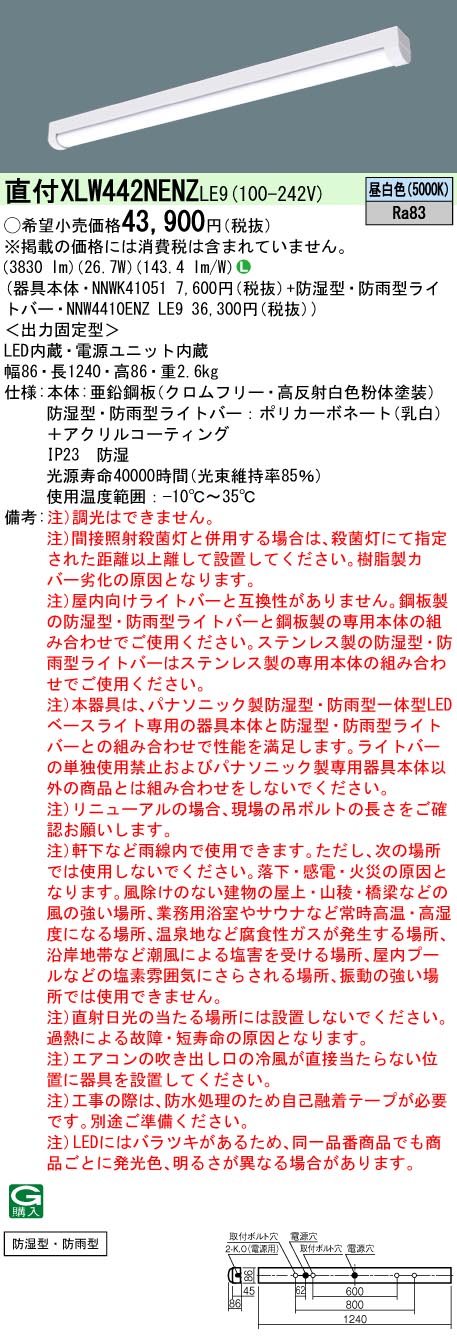 光源◆LED(昼白色) ◆色温度:5000 K ◆光源寿命40000時間(光束維持率85%)寸法・重量◆幅:86 mm ◆長:1240 mm ◆高:86 mm◆質量:2.6 kg仕様・注意事項◆器具光束:3830 lm ◆安定器出力型:定格出力型 ◆安定器補足:《出力固定型》 ◆電圧:100〜242 V ◆消費電力:26.7 W ◆消費効率:143.4 lm/W◆【本体】亜鉛鋼板(クロムフリー・高反射白色粉体塗装)◆IP23 防湿◆使用温度範囲:−10℃〜35℃◆Ra83◆注)調光はできません。◆注)屋内向けライトバーと互換性がありません。防湿型・防雨型ライトバーと専用本体の組み合わせでご使用ください。◆注)本器具は、パナソニック製防湿型・防雨型一体型LEDベースライト専用の器具本体と防湿型・防雨型ライトバーとの組み合わせで性能を満足します。ライトバーの単独使用禁止およびパナソニック製専用器具本体以外の商品とは組み合わせをしないでください。◆注)リニューアルの場合、現場の吊ボルトの長さをご確認お願いします。◆注)軒下など雨線内の屋側でご使用になれます。ただし、次の場所では使用しないでください。落下・感電・火災の原因となります。建物の屋上・山稜・橋梁などの風の強い場所、業務用浴室やサウナなど常時高温・高湿度になる場所、温泉地など腐食性ガスが発生する場所、沿岸地帯など潮風による塩害を受ける場所、屋内プールなどの塩素雰囲気にさらされる場所、振動の強い場所では使用できません。◆注)エアコンの吹き出し口の冷風が直接当たらない位置に器具を設置してください。◆注)工事の際は、防水処理のため自己融着テープが必要です。別途ご準備ください。◆注)LEDにはバラツキがあるため、同一品番商品でも商品ごとに発光色、明るさが異なる場合があります。※本商品は複数商品のセット型番です。商品はセットの構成品番にて到着します。 ※本商品はメーカー正箱において、ケース入数2以上で梱包されている商品です。そのため、ご注文数量によっては正箱ではない梱包でのお届けとなる場合がございます。(商品は新品未使用) ※取付工事は必ず、工事店、電気店(有資格者)に依頼してください。一般の方の工事は禁止されています。
