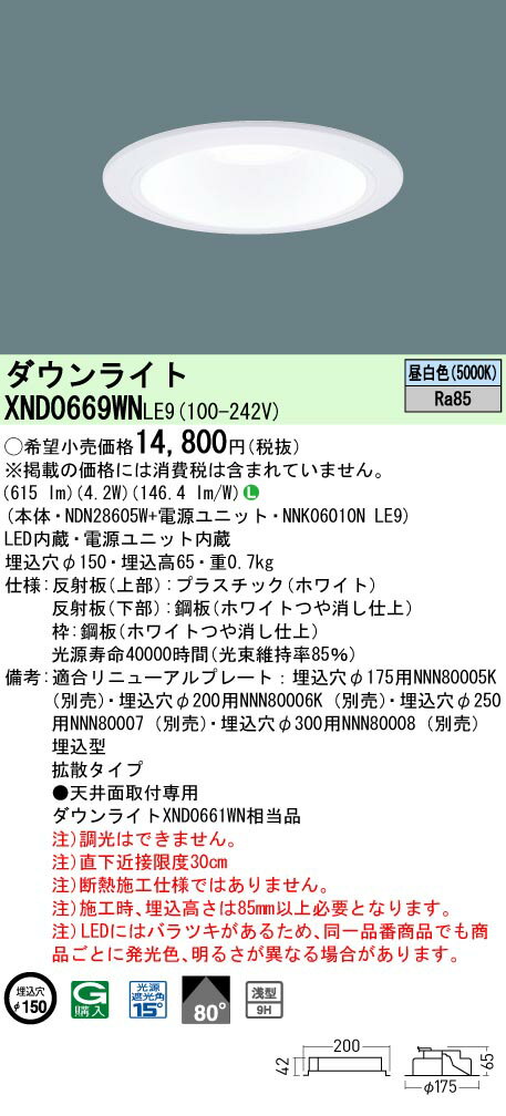 ◆埋込穴径:φ150mm◆埋込高:65mm◆質量:0.7kg◆LED(昼白色)◆色温度:5000K◆光源寿命40000時間(光束維持率85%)子品番:【本体】NDN28605W【電源ユニット】NNK06010NLE9※本商品は複数商品のセット型番です。商品はセットの構成品番にて到着します。 ※取付工事は必ず、工事店、電気店(有資格者)に依頼してください。一般の方の工事は禁止されています。