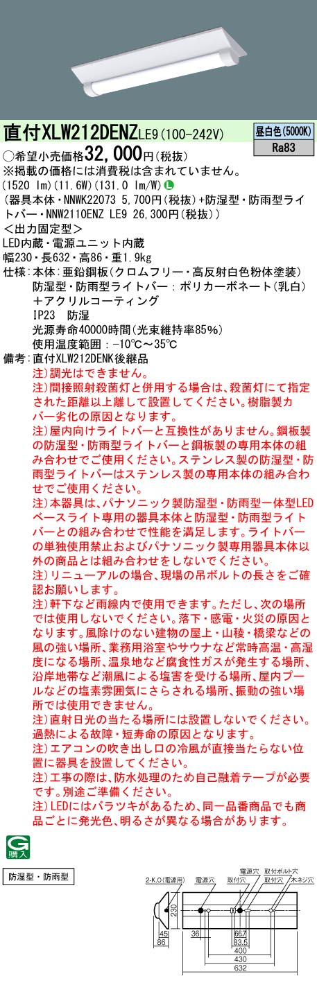 光源◆LED(昼白色) ◆色温度:5000 K ◆光源寿命40000時間(光束維持率85%寸法・重量◆幅:230 mm ◆長:632 mm ◆高:86 mm◆質量:1.9 kg仕様・注意事項◆器具光束:1520 lm ◆安定器出力型:定格出力型 ◆安定器補足:《出力固定型》 ◆電圧:100〜242 V ◆消費電力:11.6 W ◆消費効率:131 lm/W◆【本体】亜鉛鋼板(クロムフリー・高反射白色粉体塗装)◆IP23 防湿◆使用温度範囲:−10℃〜35℃◆Ra83◆注)調光はできません。◆注)屋内向けライトバーと互換性がありません。防湿型・防雨型ライトバーと専用本体の組み合わせでご使用ください。◆注)本器具は、パナソニック製防湿型・防雨型一体型LEDベースライト専用の器具本体と防湿型・防雨型ライトバーとの組み合わせで性能を満足します。ライトバーの単独使用禁止およびパナソニック製専用器具本体以外の商品とは組み合わせをしないでください。◆注)リニューアルの場合、現場の吊ボルトの長さをご確認お願いします。◆注)軒下など雨線内の屋側でご使用になれます。ただし、次の場所では使用しないでください。落下・感電・火災の原因となります。建物の屋上・山稜・橋梁などの風の強い場所、業務用浴室やサウナなど常時高温・高湿度になる場所、温泉地など腐食性ガスが発生する場所、沿岸地帯など潮風による塩害を受ける場所、屋内プールなどの塩素雰囲気にさらされる場所、振動の強い場所では使用できません。◆注)エアコンの吹き出し口の冷風が直接当たらない位置に器具を設置してください。◆注)工事の際は、防水処理のため自己融着テープが必要です。別途ご準備ください。◆注)LEDにはバラツキがあるため、同一品番商品でも商品ごとに発光色、明るさが異なる場合があります。※本商品は複数商品のセット型番です。商品はセットの構成品番にて到着します。 ※取付工事は必ず、工事店、電気店(有資格者)に依頼してください。一般の方の工事は禁止されています。