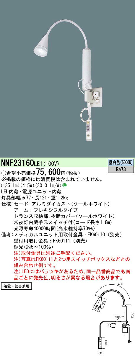 仕様・注意事項◆器具光束:135 lm ◆電圧:100 V ◆消費電力:4.5 W ◆消費効率:30 lm/W◆【セード】アルミダイカスト(クールホワイト)◆【トランス収納部】樹脂カバー(クールホワイト)◆常夜灯内蔵手元スイッチ付(コード長さ1.8m)◆Ra73【メディカルユニット用取付金具】FK60110 (別売)【壁付用取付金具】FK60111 (別売)◆調光(約5〜100%)◆注)取付金具は別途ご手配ください。◆注)写真はFK60111と2つ用スイッチボックスなどとの組み合わせ例です。◆注)LEDにはバラツキがあるため、同一品番商品でも商品ごとに発光色、明るさが異なる場合があります。寸法・質量◆質量:1.2 kg光源◆LED(昼白色) ◆色温度:5000 K ◆光源寿命40000時間(光束維持率70%)ランプトランスLED内蔵電源ユニット内蔵※取付工事は必ず、工事店、電気店(有資格者)に依頼してください。一般の方の工事は禁止されています。