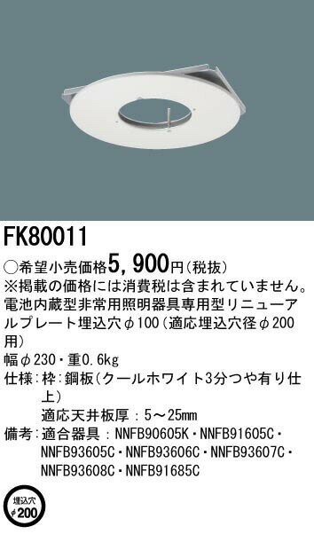 [法人限定][即納在庫有り] FK80011 パナソニック ダウンライト リニューアルプレートφ100 埋込穴φ200用 [ FK80011 ]【電池内蔵形】