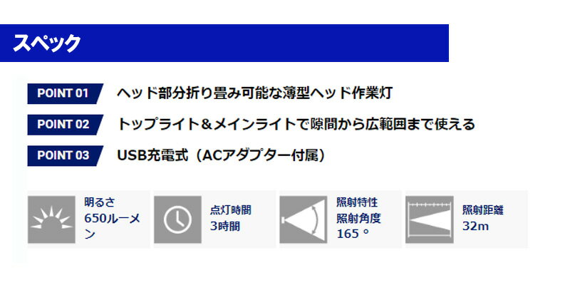 GENTOS 大人気の GZ-213 (GZ213)の後継機種GZ-213 に比べ約100ルーメン明るさがアップ!【仕様】使用光源:高輝度チップタイプ白色LED×1個、高輝度白色COB LED×1個明るさ(約):50ルーメン(トップライト)/ 250ルーメン(Ecoモード時)/ 650ルーメン(Highモード時)光度(約):19カンデラ(トップライト)/ 115カンデラ(Ecoモード時)/ 258カンデラ(Highモード時)使用電池:リチウムイオン充電池 3.7V 3,350mAh内蔵充電時間(約):5時間電池寿命:充放電 約500回点灯時間(約):18時間(トップライト)/ 9時間(Ecoモード)/ 3時間(Highモード)照射特性:照射角度 165°照射距離(約):32m(最大時)保護等級:耐塵・防滴仕様(IP64準拠)落下耐久:2m落下耐久本体サイズ(約):W38.0×H325.0×D45.5mm本体質量(約):280g(電池含む)付属品:専用Micro USBケーブル(50cm)、専用ACアダプターJANコード:4950654 048803【特徴】USB充電式COB LED:多数のLEDチップを密集して基板に直接実装した光源。多灯式に比べ多重影ができにくく、照射範囲も広い特長を持つ。底面マグネット180°可動薄型ヘッドで折り畳み可能。ダブル背面フックトップライト: ハンディトーチとしても使用可能。バッテリーインジケーター/チャージングインジケーター: 充電状態と電池残量の目安を表示。バックプッシュスイッチ 検索ワード用:工具・作業用品