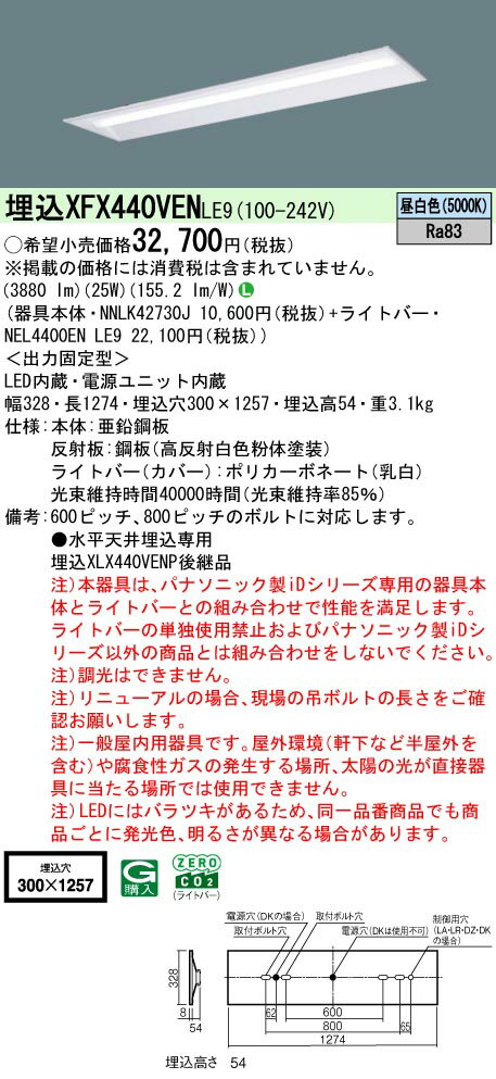 旧型番はこちら→XLX440VENP LE9 ( XLX440VENPLE9 )仕様・注意事項◆全光束:3880 lm ◆安定器出力型:定格出力型 ◆安定器補足:<出力固定型> ◆電圧:100〜242 V ◆消費電力:25 W ◆消費効率:155.2 lm/W◆【本体】亜鉛鋼板◆【反射板】鋼板(高反射白色粉体塗装)◆【ライトバー(カバー)】ポリカーボネート(乳白)◆Ra83◆600ピッチ、800ピッチのボルトに対応します。◆●水平天井埋込専用◆注)本器具は、パナソニック製iDシリーズ専用の器具本体とライトバーとの組み合わせで性能を満足します。ライトバーの単独使用禁止およびパナソニック製iDシリーズ以外の商品とは組み合わせをしないでください。◆注)調光はできません。◆注)リニューアルの場合、現場の吊ボルトの長さをご確認お願いします。◆注)一般屋内用器具です。屋外環境(軒下など半屋外を含む)や腐食性ガスの発生する場所、太陽の光が直接器具に当たる場所では使用できません。◆注)LEDにはバラツキがあるため、同一品番商品でも商品ごとに発光色、明るさが異なる場合があります。◆幅:328 mm ◆長:1274 mm ◆埋込穴幅:300 mm ◆埋込穴長:1257 mm ◆埋込高:54 mm◆質量:3.1 kg◆LED(昼白色) ◆色温度:5000 K ◆光束維持時間40000時間(光束維持率85%)◆LED(昼白色) ◆色温度:5000 K ◆光束維持時間40000時間(光束維持率85%)LED内蔵電源ユニット内蔵【下記商品からの置換えが可能です】LEKR430403N-LS9 [ LEKR430403NLS9 ]旧型番はこちら↓↓ 旧型番 XLX440VENP LE9 ※取付工事は必ず、工事店、電気店(有資格者)に依頼してください。一般の方の工事は禁止されています。 ※本商品は複数商品のセット型番です。商品はセットの構成品番にて到着します。