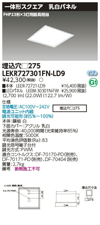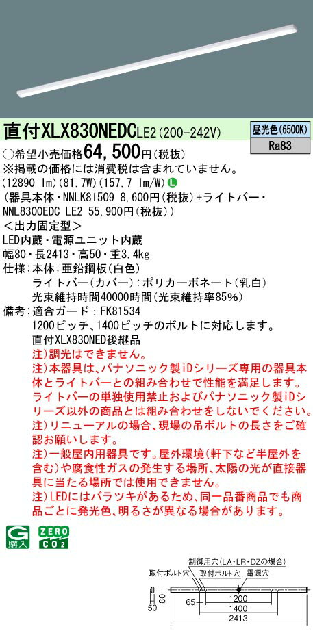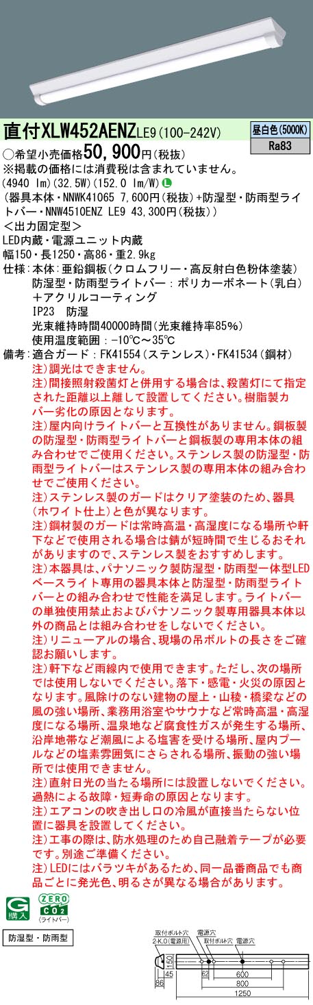 旧型番はこちら→XLX450NHNU LE9 ( XLX450NHNULE9 )仕様・注意事項◆LED(昼白色) ◆色温度:5000 K ◆光束維持時間40000時間(光束維持率85%)◆幅:80 mm ◆長:1225 mm ◆高:50 mm◆質量:1.7 kg◆器具光束:5100 lm ◆安定器出力型:定格出力型 ◆安定器補足:<出力固定型> ◆電圧:100〜242 V ◆消費電力:26.3 W ◆消費効率:193.9 lm/W◆【本体】鋼板(白色粉体塗装)◆【ライトバー(カバー)】ポリカーボネート(乳白)◆天井直付型、省エネタイプ・5200 lmタイプ・昼白色◆Ra83【適合ガード(別売)】FK41533【オプション(別売)】片反射笠アダプタFSK41020◆600ピッチ、800ピッチのボルトに対応します。◆注)本器具は、パナソニック製iDシリーズ専用の器具本体とライトバーとの組み合わせで性能を満足します。ライトバーの単独使用禁止およびパナソニック製iDシリーズ以外の商品とは組み合わせをしないでください。◆注)調光はできません。◆注)リニューアルの場合、現場の吊ボルトの長さをご確認お願いします。◆注)一般屋内用器具です。屋外環境(軒下など半屋外を含む)や腐食性ガスの発生する場所、太陽の光が直接器具に当たる場所では使用できません。◆注)片反射笠アダプタとガードを組み合わせて使用する場合は、ガードの加工が必要です。◆注)LEDにはバラツキがあるため、同一品番商品でも商品ごとに発光色、明るさが異なる場合があります。【下記商品からの置換えが可能です】LEKT407524HN-LS9 [ LEKT407524HNLS9 ]旧型番はこちら↓↓ 旧型番 XLX450NHNU LE9 ※取付工事は必ず、工事店、電気店(有資格者)に依頼してください。一般の方の工事は禁止されています。 ※本商品は複数商品のセット型番です。商品はセットの構成品番にて到着します。