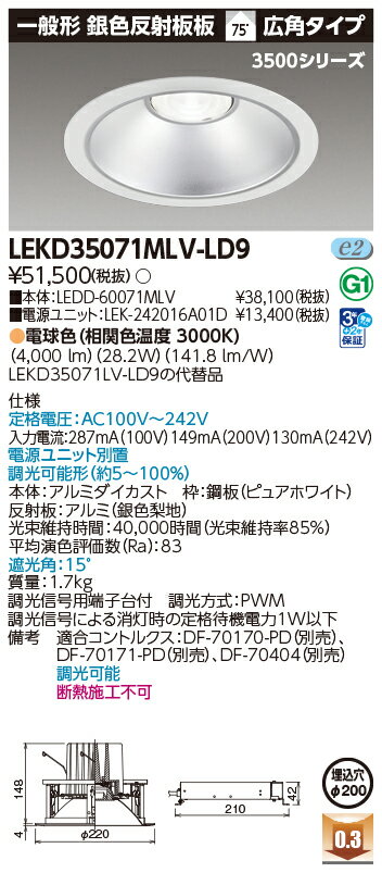 カテゴリ情報:ベースダウンライト定格電圧:100V〜242V器具幅:φ:220 mm埋め込みサイズ:φ:200 mm質量:1.7 kg調光方式:PWM制御調光範囲:約5%〜100%光色(相関色温度、平均演色評価数):電球色(3000K Ra:83)定格寿命:(光束維持率)40,000時間(光束維持率85%)器具光束:4000 lm消費電力:28.5W(100V) 28.2W(200V) 28.5W(242V)入力電流:287mA(100V) 149mA(200V) 130mA(242V)エネルギー消費効率:140.3lm/W(100V) 141.8lm/W(200V) 140.3lm/W(242V)保護等級:IP20配光角:タイプ広角タイプ遮光角15°周波数:50/60Hz配光角:75度付加機能:SL端子台/送り端子台付調光タイプHZ適合:50/60部品1:LEDD-60071MLV部品1数量:1部品2:LEK-242016A01D部品2数量:1仕様1名称:本体仕様1材質:アルミダイカスト仕様2名称:枠仕様2材質:鋼板仕様2仕上げ:ピュアホワイト仕様3名称:反射板仕様3材質:アルミ仕様3仕上げ:銀色梨地仕様8その他:調光信号による消灯時の定格待機電力1W以下補助点灯装置:電源ユニット別置 調光可能形(約5〜100%)適合器具1:DF-70170-PD適合器具2:DF-70171-PD適合器具3:DF-70404配光タイプ:帯内文字広角タイプその他備考:調光信号用端子台付その他備考:調光方式:PWMその他備考:調光可能 断熱施工不可その他備考:照射面距離:0.3旧品番: LEKD35071LV-LD9※本商品は複数商品のセット型番です。商品はセットの構成品番にて到着します。※取付工事は必ず、工事店、電気店(有資格者)に依頼してください。一般の方の工事は禁止されています。