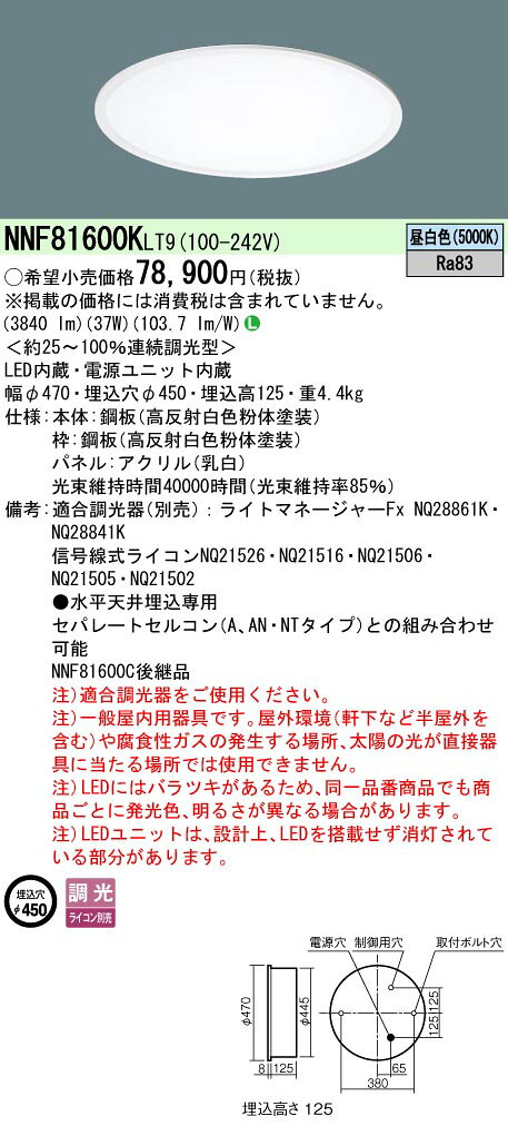 光源◆LED(昼白色) ◆色温度:5000 K ◆光束維持時間40000時間(光束維持率85%)寸法・質量◆幅:φ470 mm ◆埋込穴径:φ450 mm ◆埋込高:125 mm◆質量:4.4 kg仕様・注意事項LED照明の安心品質◆器具光束:3840 lm ◆安定器出力型:定格出力型 ◆安定器補足:<約25〜100%連続調光型> ◆電圧:100〜242 V ◆消費電力:37 W ◆消費効率:103.7 lm/W◆【本体】鋼板(高反射白色粉体塗装)◆【枠】鋼板(高反射白色粉体塗装)◆【パネル】アクリル(乳白)◆天井埋込型、乳白パネルタイプ◆Ra83【適合調光器(別売)】ライトマネージャーFx NQ28861K【適合調光器(別売)】ライトマネージャーFx NQ28841K【適合調光器(別売)】信号線式ライコンNQ21526【適合調光器(別売)】信号線式ライコンNQ21516【適合調光器(別売)】信号線式ライコンNQ21506【適合調光器(別売)】信号線式ライコンNQ21505【適合調光器(別売)】信号線式ライコンNQ21502◆●水平天井埋込専用◆セパレートセルコン(A、AN・NTタイプ)との組み合わせ可能◆注)適合調光器をご使用ください。◆注)一般屋内用器具です。屋外環境(軒下など半屋外を含む)や腐食性ガスの発生する場所、太陽の光が直接器具に当たる場所では使用できません。◆注)LEDにはバラツキがあるため、同一品番商品でも商品ごとに発光色、明るさが異なる場合があります。◆注)LEDユニットは、設計上、LEDを搭載せず消灯されている部分があります。※取付工事は必ず、工事店、電気店(有資格者)に依頼してください。一般の方の工事は禁止されています。